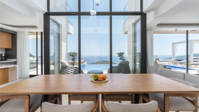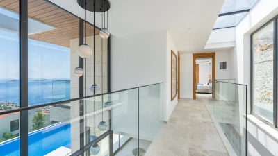 The villa's sleek interiors include an open-plan living area on the ground floor, bathed in natural light, featuring plush furnishings and a kitchen with several wooden elements. A mezzanine gallery and extensive use of glass amplifies the impact of the villa’s far-reaching Mediterranean views. The five en-suite bedrooms, spread across three floors, offer private sanctuaries with contemporary amenities. The master suite on the first floor even boasts an indoor Jacuzzi bath, perfect for unwinding after a day of sun-soaked adventures.