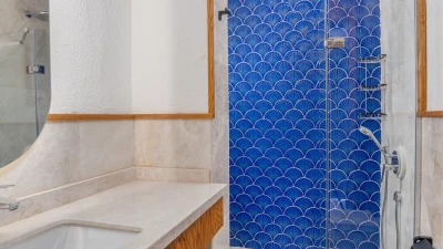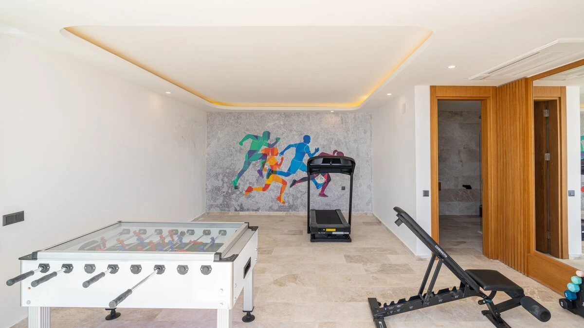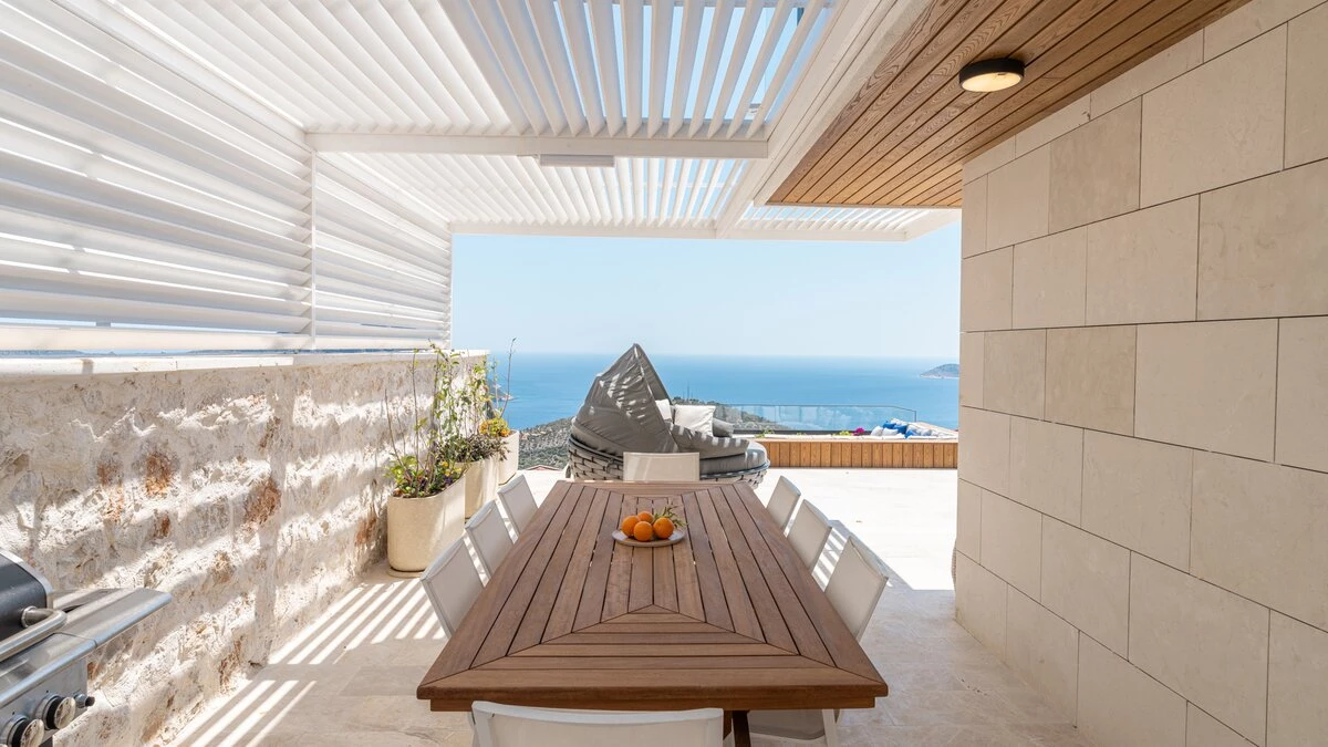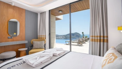 Outside, the villa presents an expansive pool terrace, furnished with oversized daybeds and cushioned seating areas, providing the ideal setting for lounging and socialising. The 10-metre infinity pool seems to merge with the horizon, offering a refreshing respite from the Turkish sun. An inviting alfresco barbecue and dining area caters to memorable gatherings under the stars. For those maintaining a fitness routine, a private gym awaits on the lower ground floor, complete with awe-inspiring sea views. Located in Kalamar Bay, the villa offers easy access to Kalkan's charming town centre and pristine beaches, allowing guests to explore the best of the Turkish Riviera.
