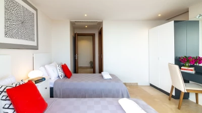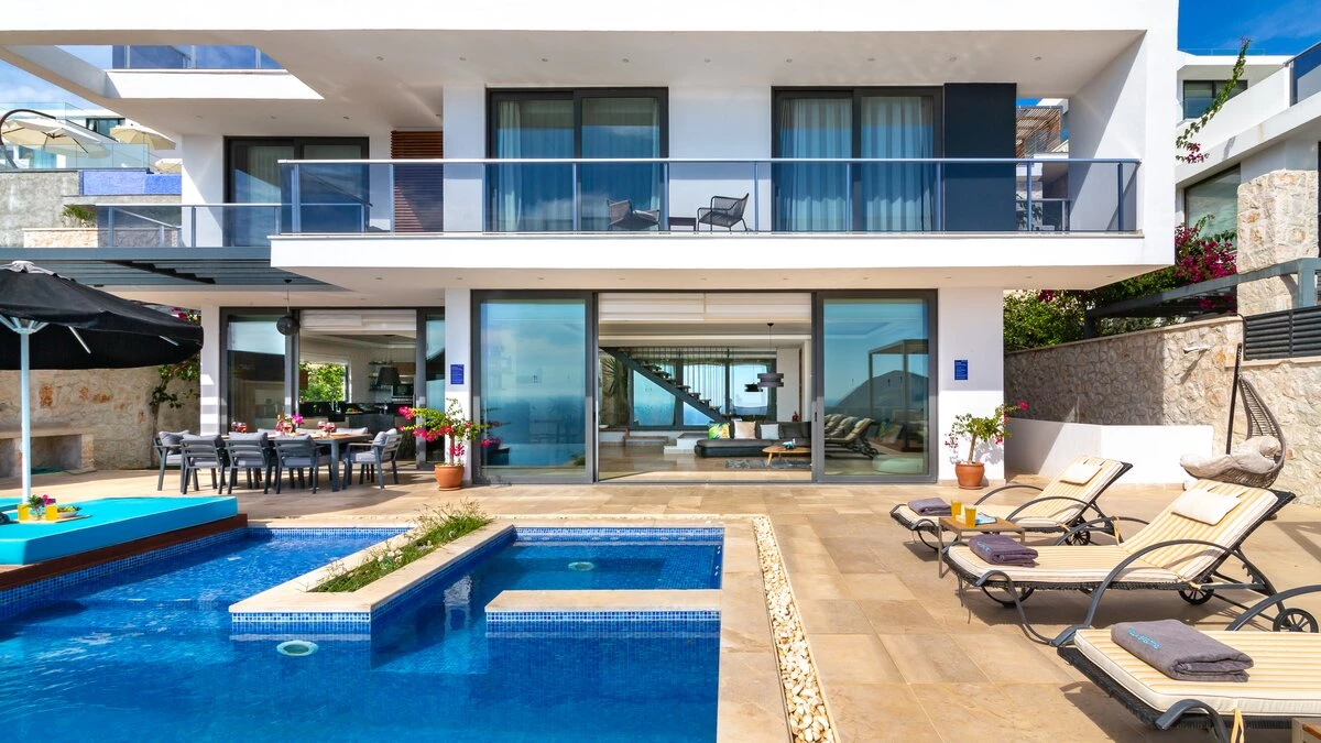 Set on a hillside with breathtaking views across the sea, Villa Ayaz is a modern villa with four en suite bedrooms and a gym.