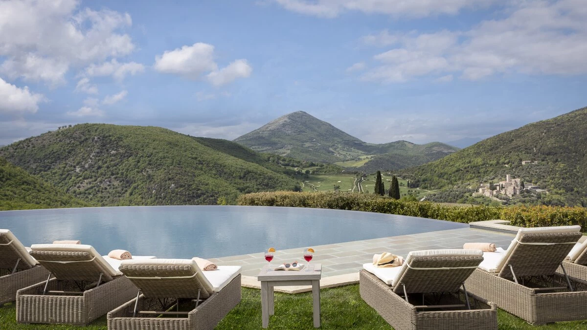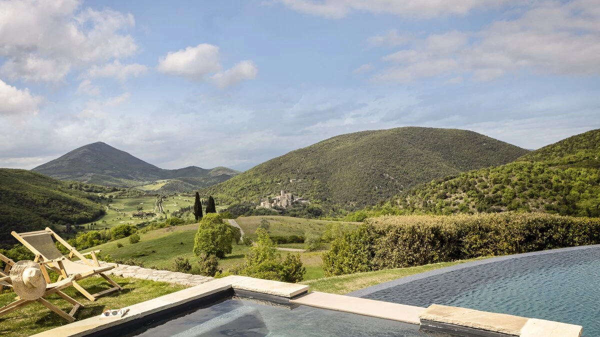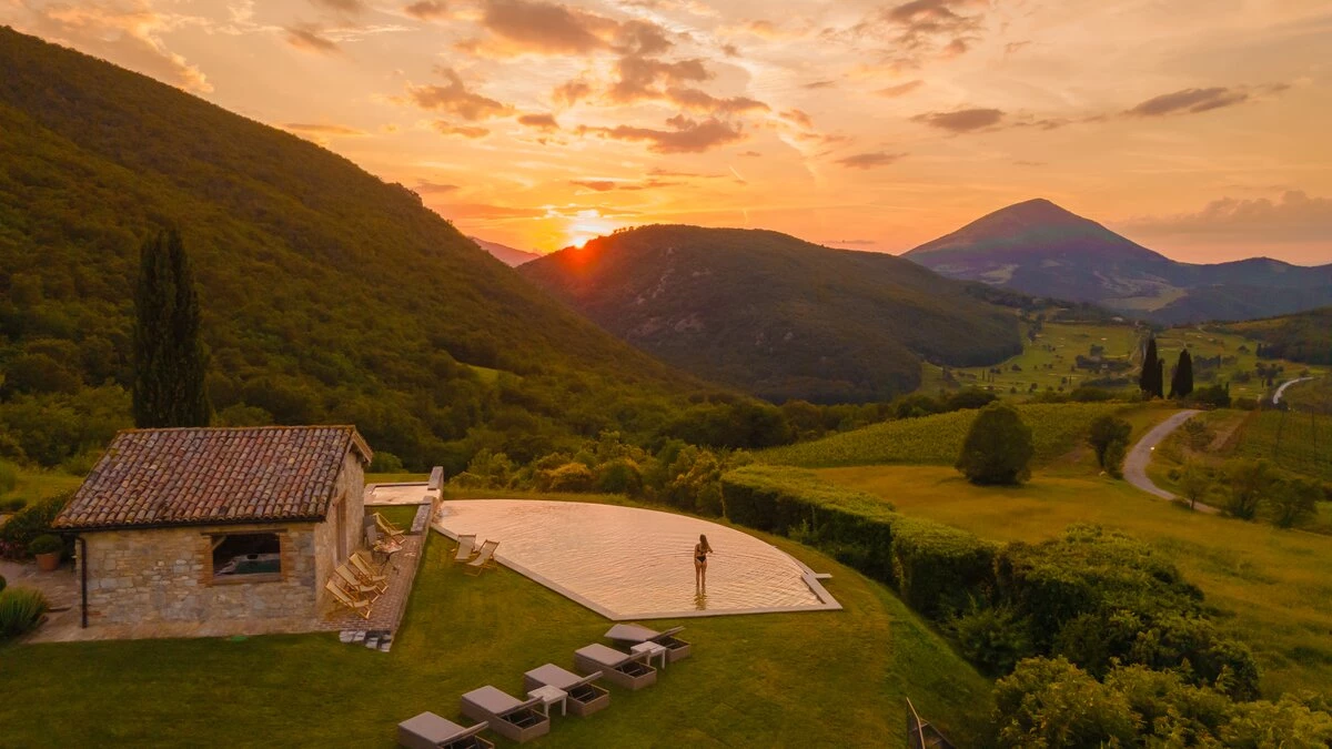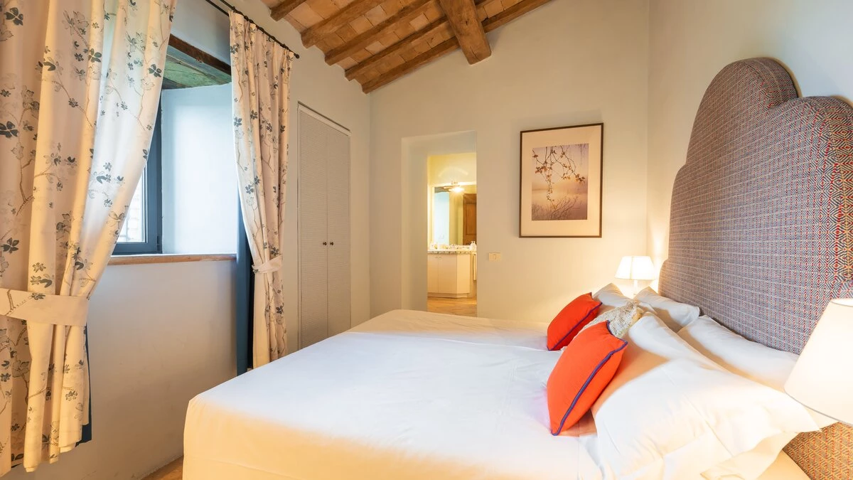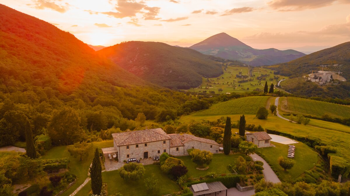This luxury villa in Umbria’s hills has its origins in the 14th century, and the former farmhouse is still steeped in charm and character, though it now sits amid immaculate lawns, and is stylishly furnished and fully equipped with 21st century comfort. Superb for a special occasion, a golfing holiday, and for gatherings of family or friends, its eight bedroom accommodation utilises all the old stone buildings, its own kitchen and living room. The get-together social space has a big sitting room and a dining room designed for sixteen guests, where cook service could be an invaluable addition. With its own putting green in the very private gardens, the villa’s beautiful infinity pool and adjacent Jacuzzi gaze out to views of Antognolla’s medieval castle and Robert Trent Jones Jr golf course, which can be reached in five minutes via a private path. There is a restaurant and bar at the Golf Club, Pierantonio’s shops are 9km away, and Umbertide is 15km from the villa.