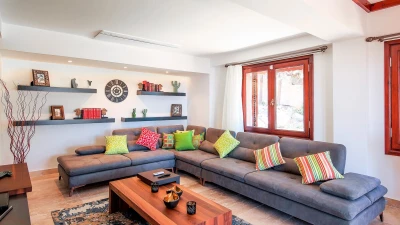 Villa Caria is a perfectly private villa surrounded by beautiful bright bougainvillea accessed via a private driveway. The villa has quite an array of facilities, including a wonderful children’s play area with indoor and outdoor swings, a tree house and a climbing wall, meaning kids will be entertained for the entire holiday; while everyone can enjoy use of the games and cinema room.