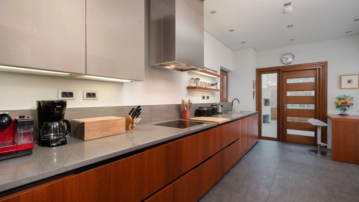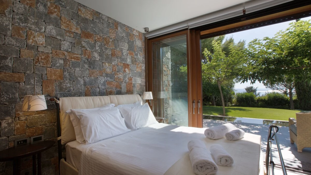 Basking in the blues of the Aegean Sea, it’s all about the views at this upscale house in northern Crete. Just ten minutes by car from Chania’s gorgeous harbourfront, Villa Cassandra is a standout villa for 10 that combines a range of contemporary comforts with an architectural sophistication. Along the upper levels of the house is the large master bedroom – a hub of indulgence and relaxation thanks to its very own private plunge pool. Downstairs, the kitchen and dining areas promise high-end facilities, accompanied by a queen-sized double bedroom with a sofa bed and direct access to the outside pool terrace. On the lower ground floor, there are two more double bedrooms – both spacious with en suite bathrooms and views overlooking the surrounding gardens. A gym and exclusive spa area – equipped with a Turkish steam bath and sauna – complete this lower level. Head outside and the private pool terrace is a complete sunset-worthy trap with a gorgeous infinity pool, furnished relaxation area and an outdoor kitchen equipped with a pizza oven and built-in barbecue.