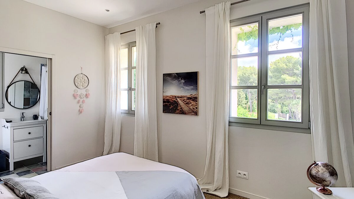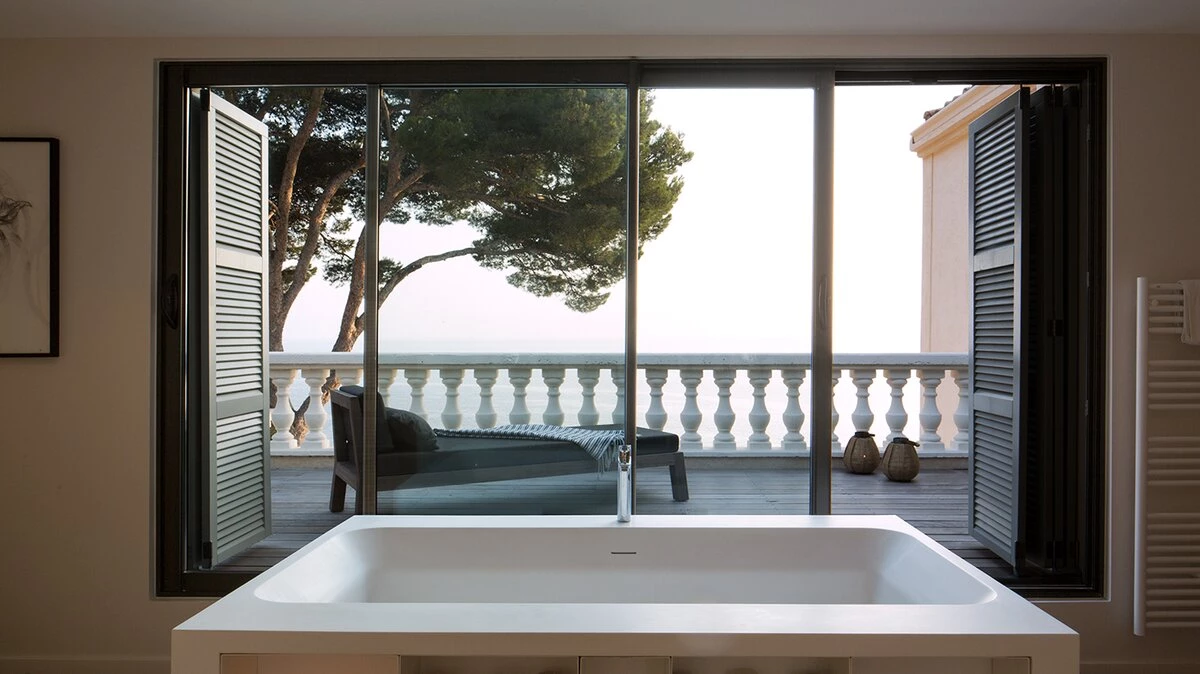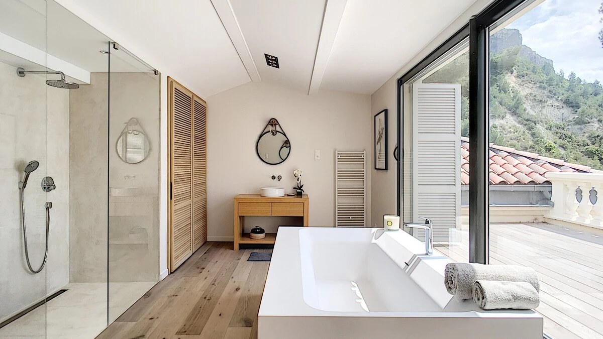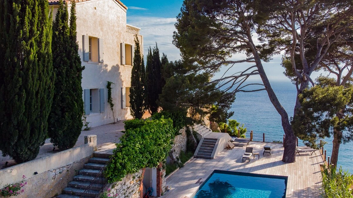 The exterior of this villa features a wonderful private pool, plus a large terrace overlooking the beach and turquoise waters. The property is located 1.5km from Cassis, a Mediterranean fishing port overlooked by a centuries-old castle. Here, visitors will find a brilliant selection of restaurants and cafes. Nearby are stunning limestone cliffs and lovely vineyards. The closest airport is Marseille, just 55km from the villa.