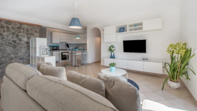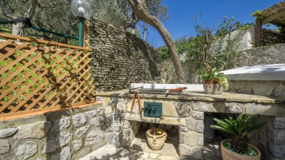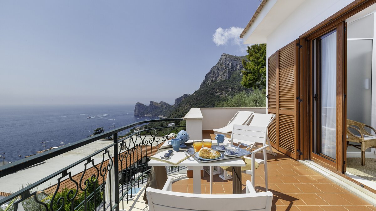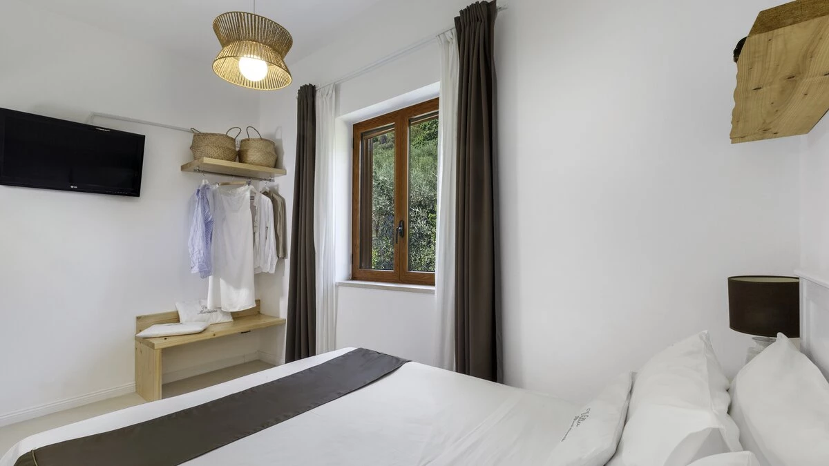 Inside the villa is cool and comfortable. The open plan living area is decorated in neutral shades with tasteful decor in blues to accentuate the villa’s surroundings; there’s a comfortable sofa and a large television with Sky, plus a fully equipped kitchen area. A separate dining room gives guests the option to dine altogether indoors. All four comfortable bedrooms around the villa boast their own views out onto Sorrento. The separate annexe offers an additional small kitchen, breakfast bar, living space and en suite bedroom with a balcony.