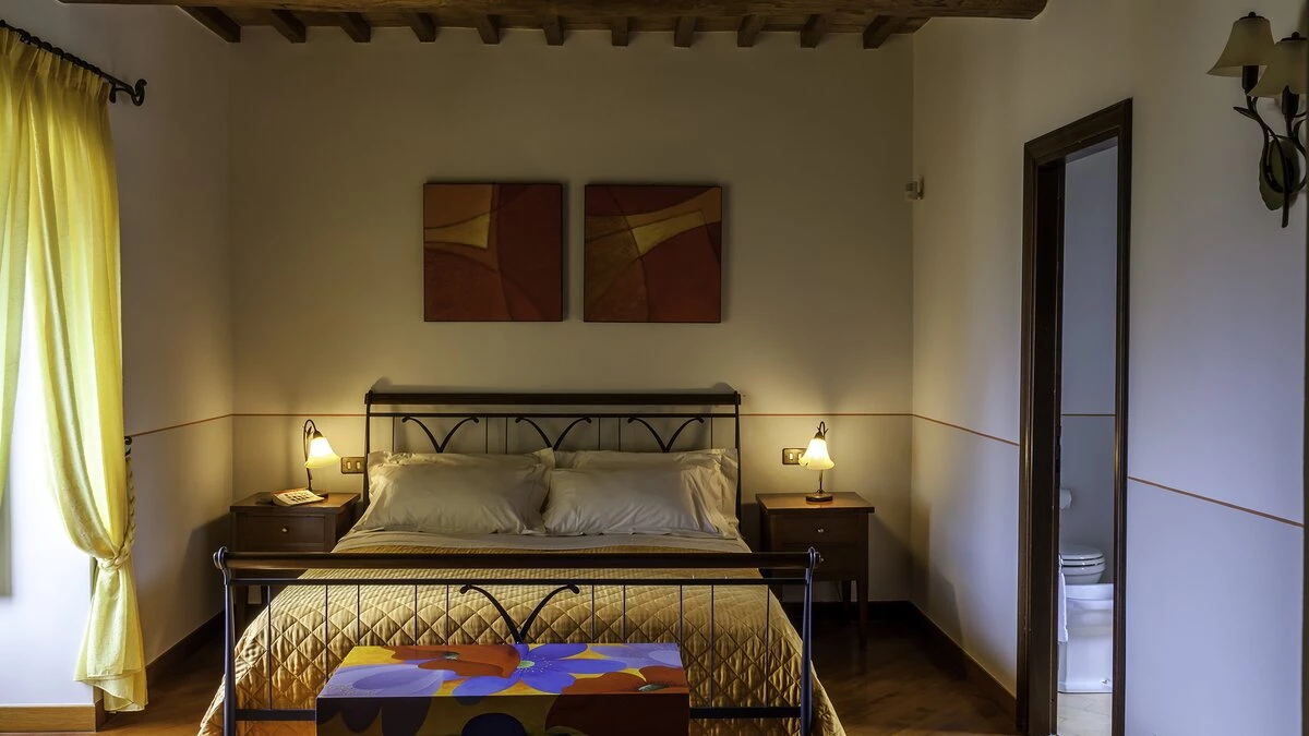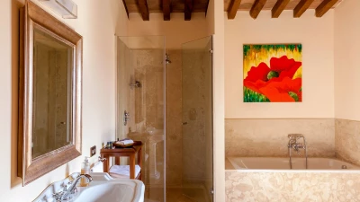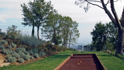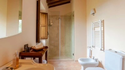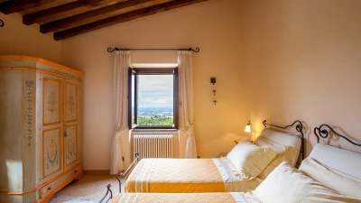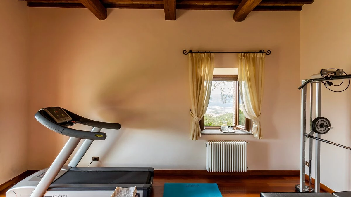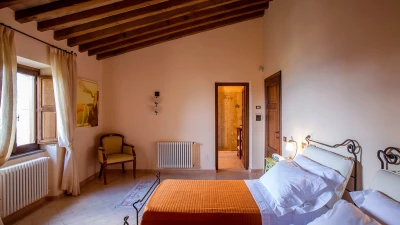 The Guest House contains four bedrooms all on the first floor; two twin, one with private bathroom and the other one with shower room en suite, and two doubles, one opening to private balcony and bathroom en suite, and the other with a private shower room. A great addition to the Guest House is the well-equipped gym, the sauna, and the apartment accessed externally with double bedroom, sitting room, shower room and kitchen. The accommodation is therefore ideal for three families sharing. Villa Chianina is twenty-five minutes by road from the historic city of Orvieto and a short drive from the towns of Fabro and Allerona.