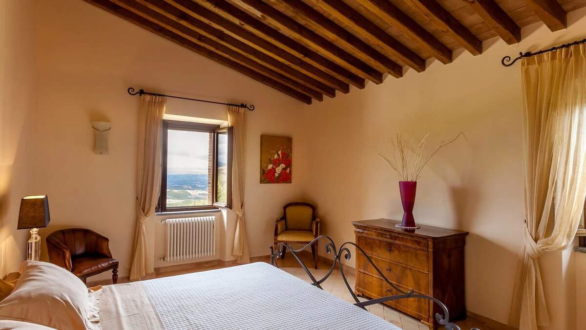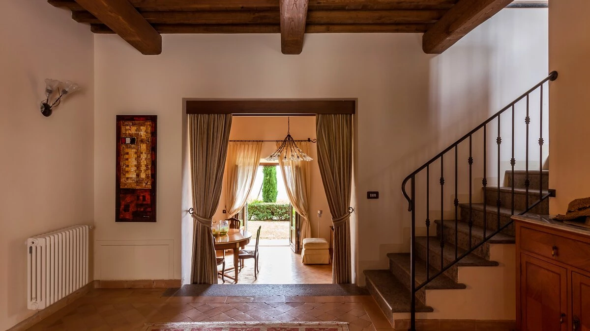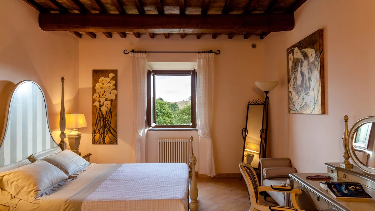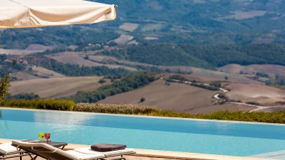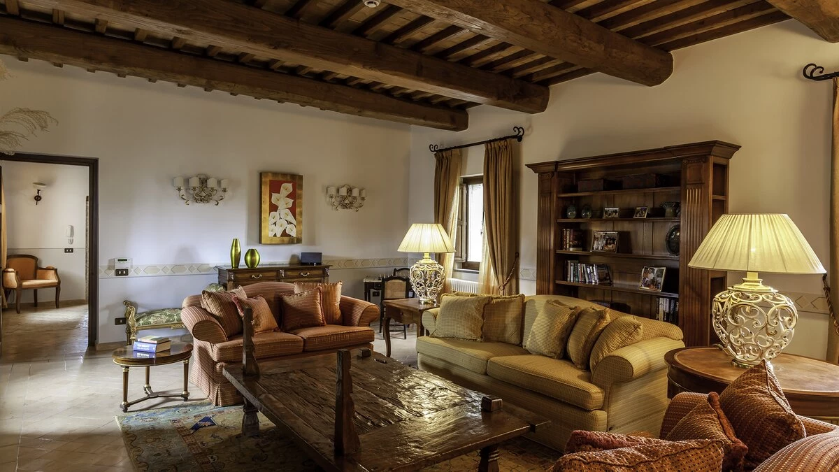 Set in a hillside location amongst olive trees, with endless views of Umbria’s countryside, Villa Chianina is the ideal holiday destination for large families or groups of friends looking for a relaxing retreat in a private location. A courtyard connecting the Main Villa and the Guest House overlooks the private infinity pool, with plenty of sun loungers to relax while gazing out over the landscape stretching out below. This property has a typical Italian design and is furnished in a country-chic style with state-of-the-art facilities for extra comfort. With wooden-beamed ceilings, pastel tones and modern furnishings, Villa Chianina is an elegant blend of traditional and contemporary luxury. There are numerous outdoor spaces, from the covered al fresco dining and barbecue area, to the various seating and lounge zones throughout the property. The Main Villa boasts a luxurious entrance hall, a well-equipped kitchen, a breakfast room, and dining room on the ground floor.The upper level includes a TV room, an exclusive bar, a snooker room and a lounge opening to the balcony. The second floor is made up of a master double bedroom with private bathroom and a double bedroom with shower room en suite; the remaining double bedroom with shower room en suite is on the third floor.