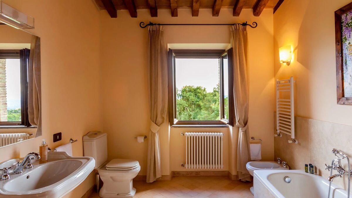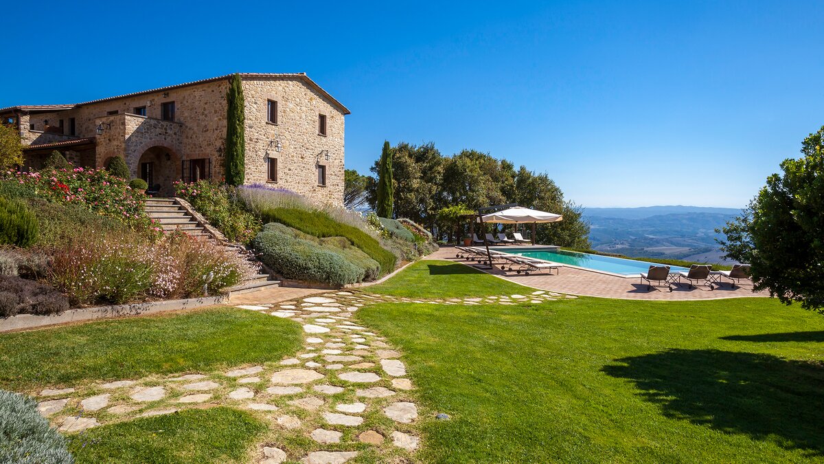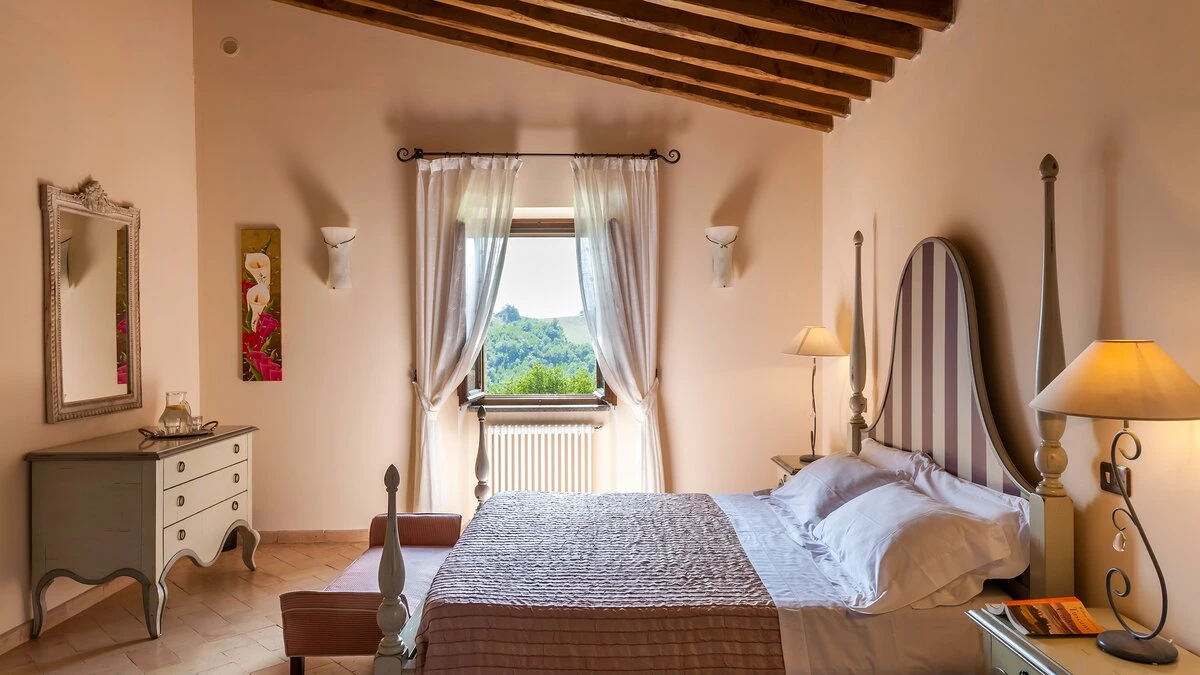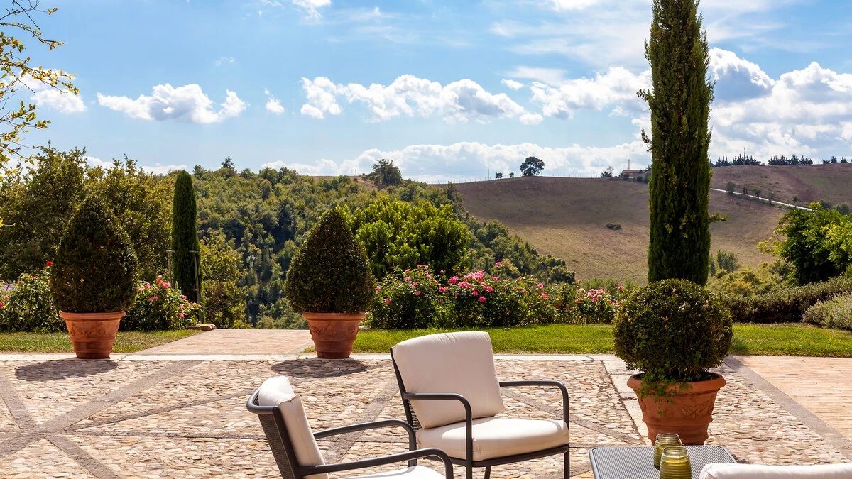Set in a hillside location amongst olive trees, with endless views of Umbria’s countryside, Villa Chianina is the ideal holiday destination for large families or groups of friends looking for a relaxing retreat in a private location. A courtyard connecting the Main Villa and the Guest House overlooks the private infinity pool, with plenty of sun loungers to relax while gazing out over the landscape stretching out below. This property has a typical Italian design and is furnished in a country-chic style with state-of-the-art facilities for extra comfort. With wooden-beamed ceilings, pastel tones and modern furnishings, Villa Chianina is an elegant blend of traditional and contemporary luxury. There are numerous outdoor spaces, from the covered al fresco dining and barbecue area, to the various seating and lounge zones throughout the property. The Main Villa boasts a luxurious entrance hall, a well-equipped kitchen, a breakfast room, and dining room on the ground floor.The upper level includes a TV room, an exclusive bar, a snooker room and a lounge opening to the balcony. The second floor is made up of a master double bedroom with private bathroom and a double bedroom with shower room en suite; the remaining double bedroom with shower room en suite is on the third floor.