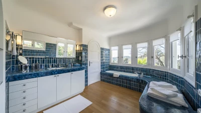 Villa Claudia is a lovely, spacious villa set among pines and oaks that drop away through the Malvan Valley towards the sea. This property is sleek and retro, offering a harmonious atmosphere designed for relaxed living. Inside, guests will discover a spacious lounge with two french doors that open onto the southern upper terrace. This cosy room is equipped with plenty of comfy seats and a working fireplace. The open-plan dining area provides seating for twelve guests, opening onto the sunny portico seating area outside. The sleek kitchen is well-equipped, complete with a marble tiled floor and an opening onto the al fresco dining terrace. The ground floor is also home to a wonderful library, reading area and study. On the upper ground floor, guests will find a useful laundry room, as well as a boulevard entrance. The lower ground room is home to the first of six bedrooms, a minimalistic double bedroom with a lovely shower room en suite. Head up to the first floor to discover three more double bedrooms, each with an en suite, some with private terrace or balcony. The annexe offers the perfect spot for guests looking for additional privacy, complete with a sitting room, kitchen and dining area, and two en suite bedrooms.