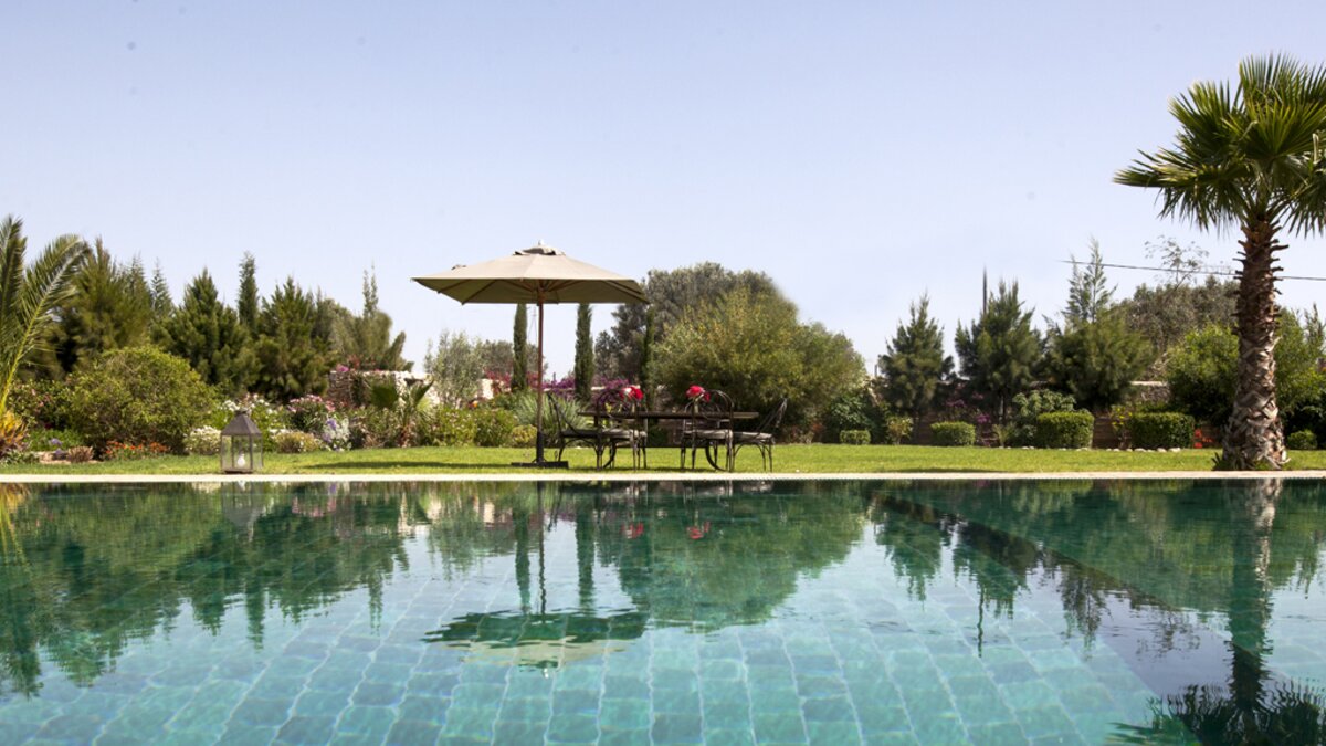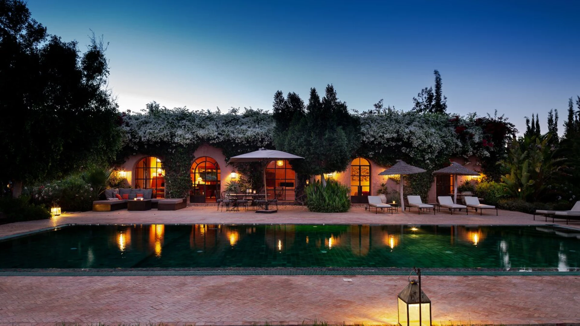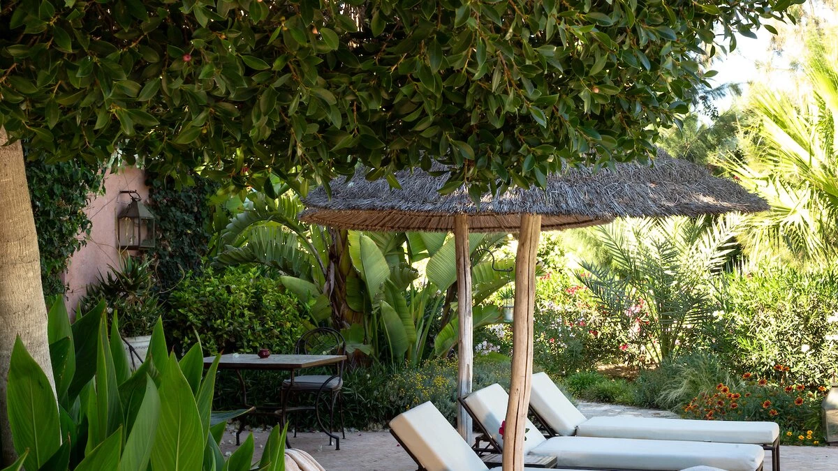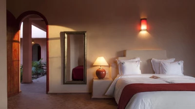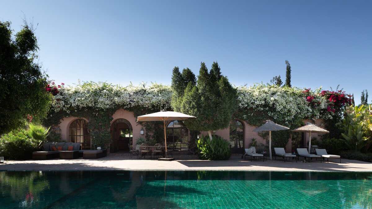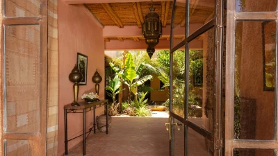 Villa Cortile is one of several very spacious and comfortable fully staffed private villas set in private gardens within the grounds of a small and very special hotel, set in a river valley, sheltered from the desert winds.  All the villas are set in beautiful lush  gardens and their décor showcases the richly coloured exotic fabrics and distinctive tiles that Morocco is well known for. The bedrooms are flexibly furnished and can be made up as either double or twin and are of a consistent size, with air conditioning and either a bath or shower room en suite. The spacious living rooms catch the cooling breezes, and open on to a broad terrace, with al fresco sitting and dining areas, each with a beautiful large pool with Moroccan tiling.