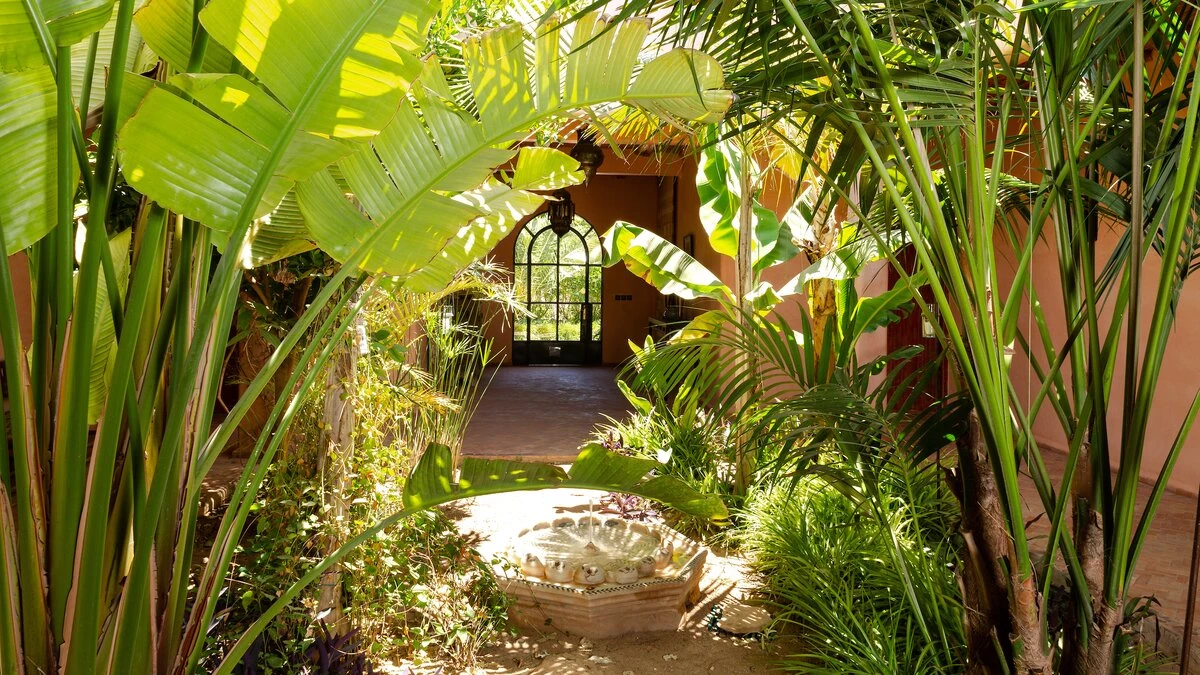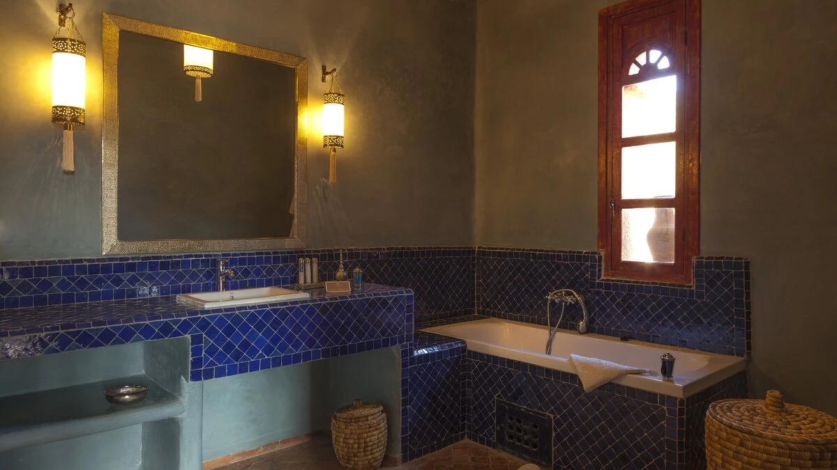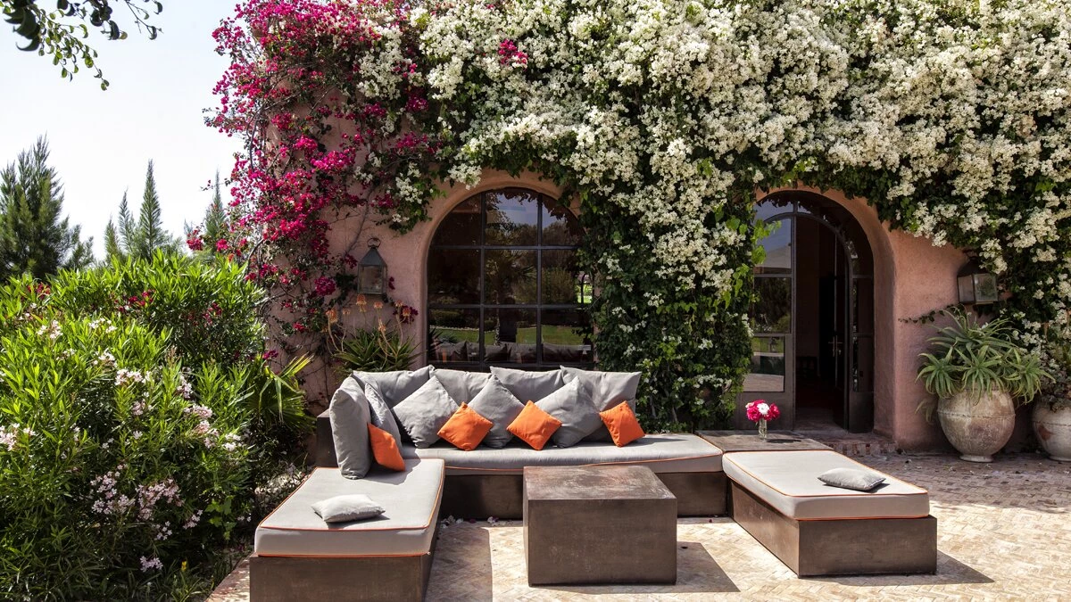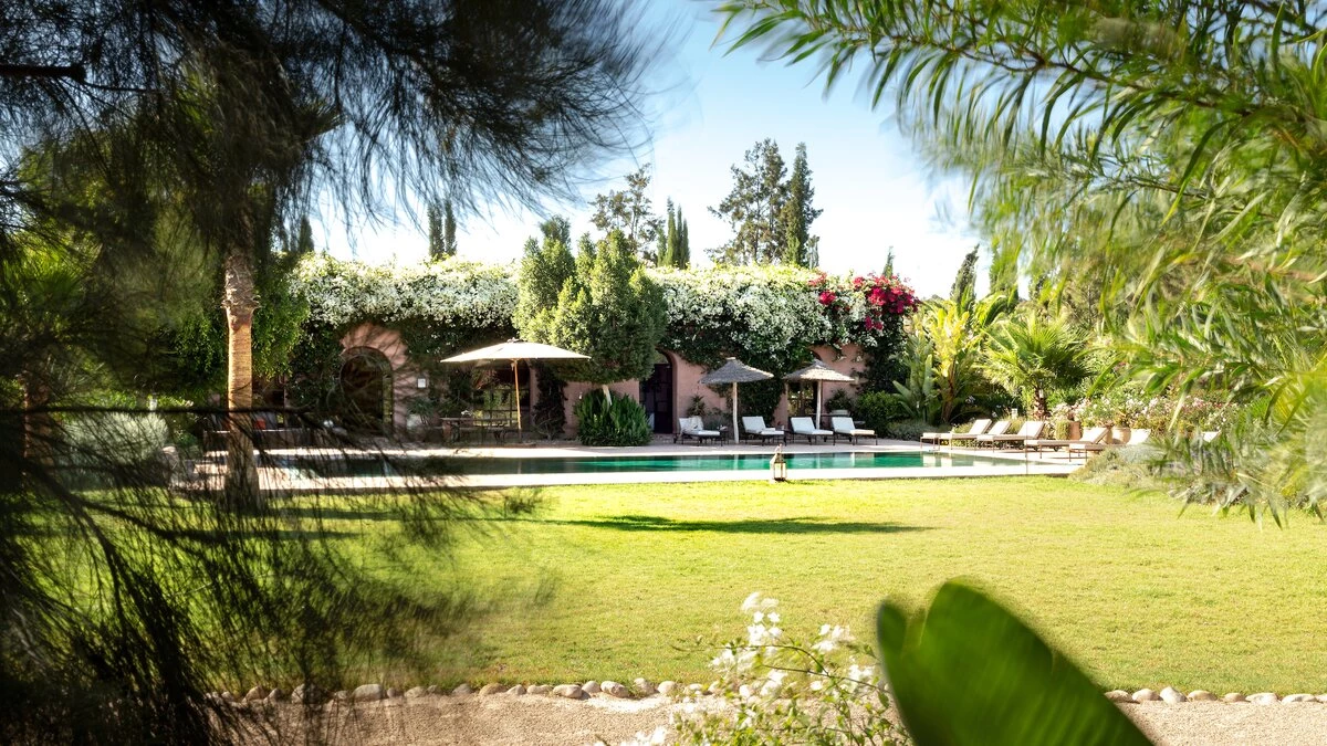 Villa Cortile is one of several very spacious and comfortable fully staffed private villas set in private gardens within the grounds of a small and very special hotel, set in a river valley, sheltered from the desert winds.  All the villas are set in beautiful lush  gardens and their décor showcases the richly coloured exotic fabrics and distinctive tiles that Morocco is well known for. The bedrooms are flexibly furnished and can be made up as either double or twin and are of a consistent size, with air conditioning and either a bath or shower room en suite. The spacious living rooms catch the cooling breezes, and open on to a broad terrace, with al fresco sitting and dining areas, each with a beautiful large pool with Moroccan tiling.