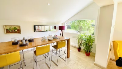 Inside, the villa feels effortlessly inviting. The open-plan living, dining, and kitchen area is filled with natural light, creating a space that’s both functional and warm. Contemporary furnishings complement the home’s traditional design, whilst the kitchen is perfect for preparing meals to enjoy indoors or on the terrace. Each bedroom is designed with comfort and privacy at its core, featuring bright, airy spaces and en suite shower rooms. The upstairs third bedroom offers an extra layer of seclusion, rounding out a layout that perfectly balances communal areas with private sanctuaries.