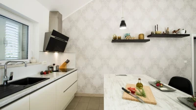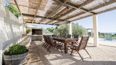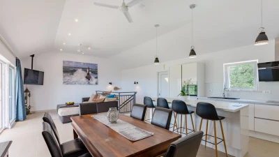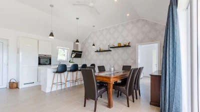 Inside, Villa Crystal features a welcoming open-plan layout that encourages togetherness. The modern living area flows seamlessly into a well-equipped kitchen, ideal for culinary adventures. Each of the spacious bedrooms is thoughtfully designed for comfort, while the entertainment room provides fun for guests of all ages. Outdoor dining is a highlight here, with a covered area and barbecue setup perfect for al fresco meals out under the stars.