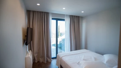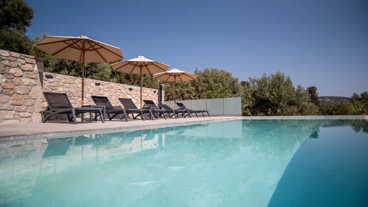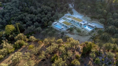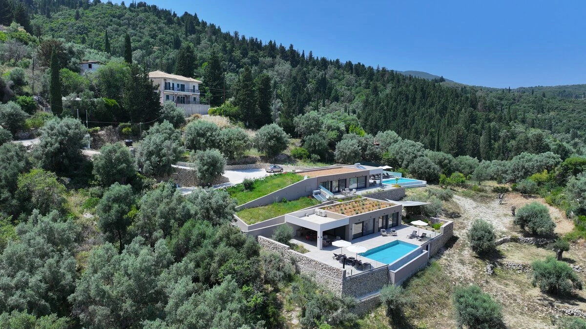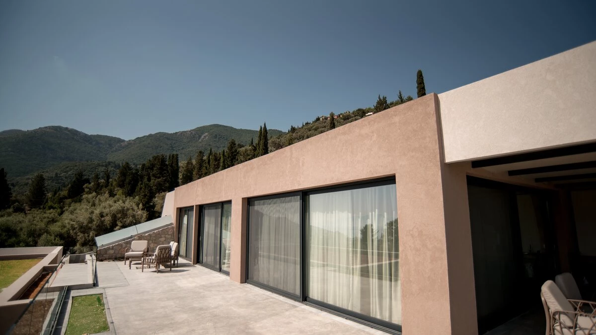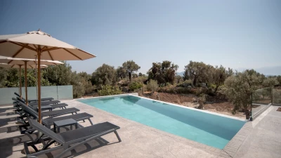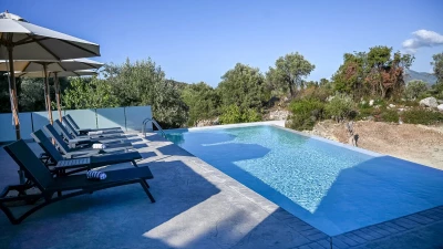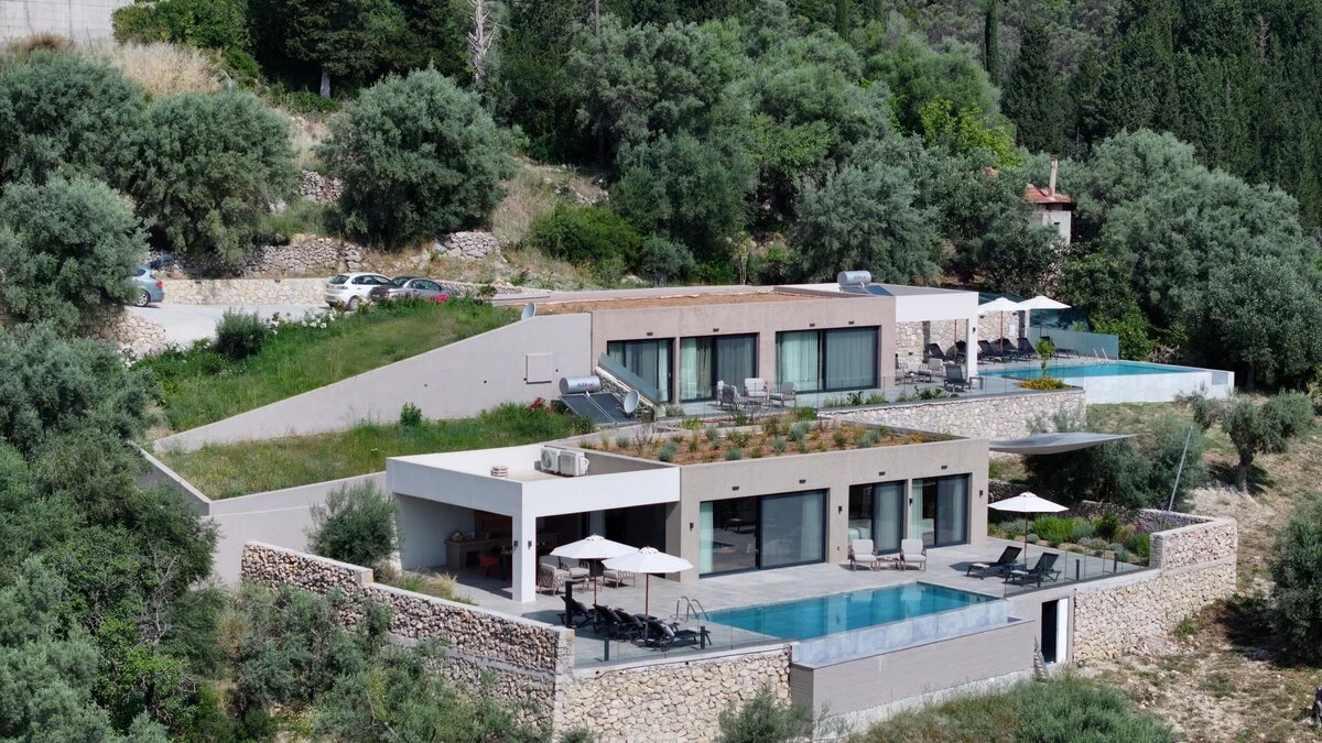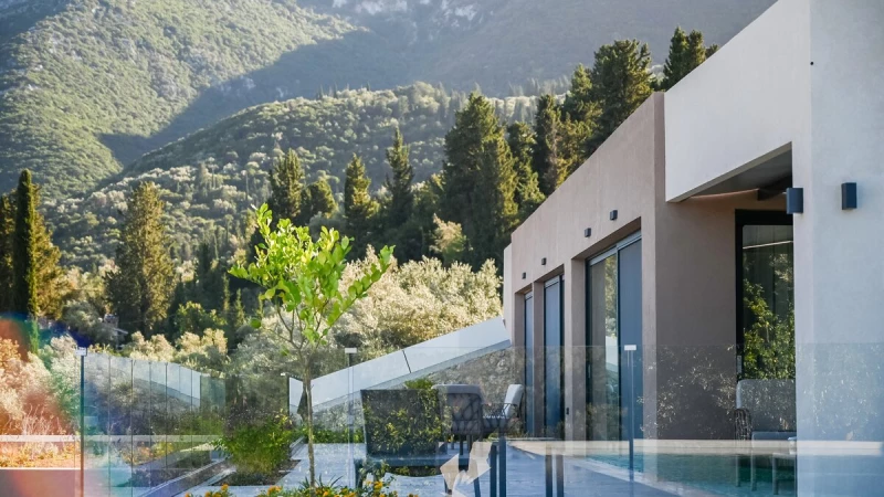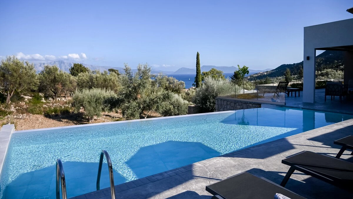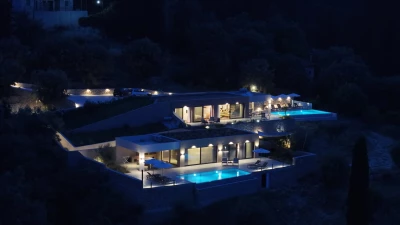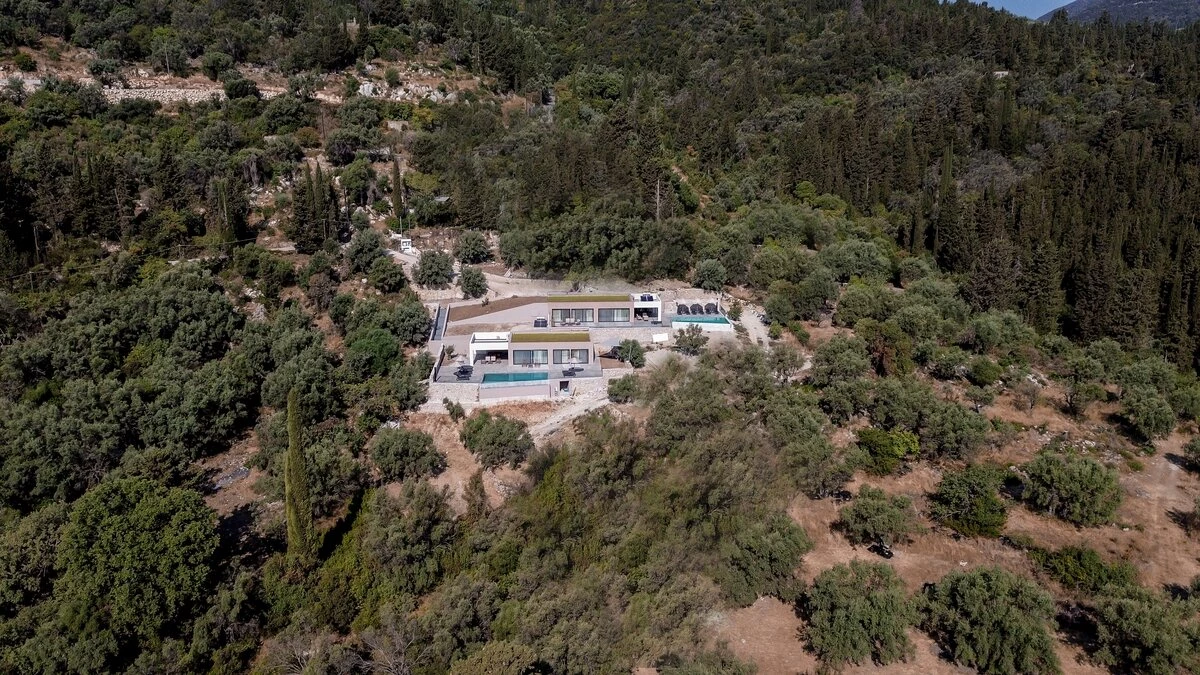 Nestled among ancient olive groves on Mount Skaros' lower slopes, Villa Daphne enjoys a privileged position on Lefkada's eastern coast. Surrounded by greenery, this two-bedroom villa offers complete privacy with panoramic views stretching across the Ionian Sea to the distant Acarnanian mountains. Designed for those who appreciate thoughtful architecture, Villa Daphne balances contemporary lines with the raw beauty of its natural surroundings.
