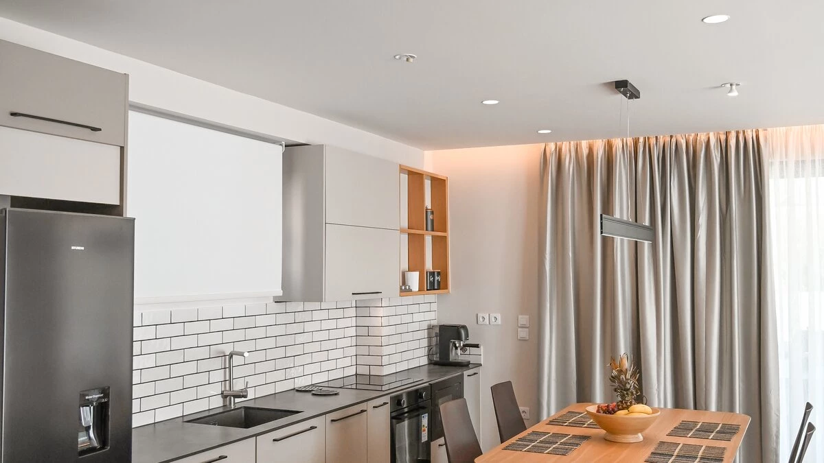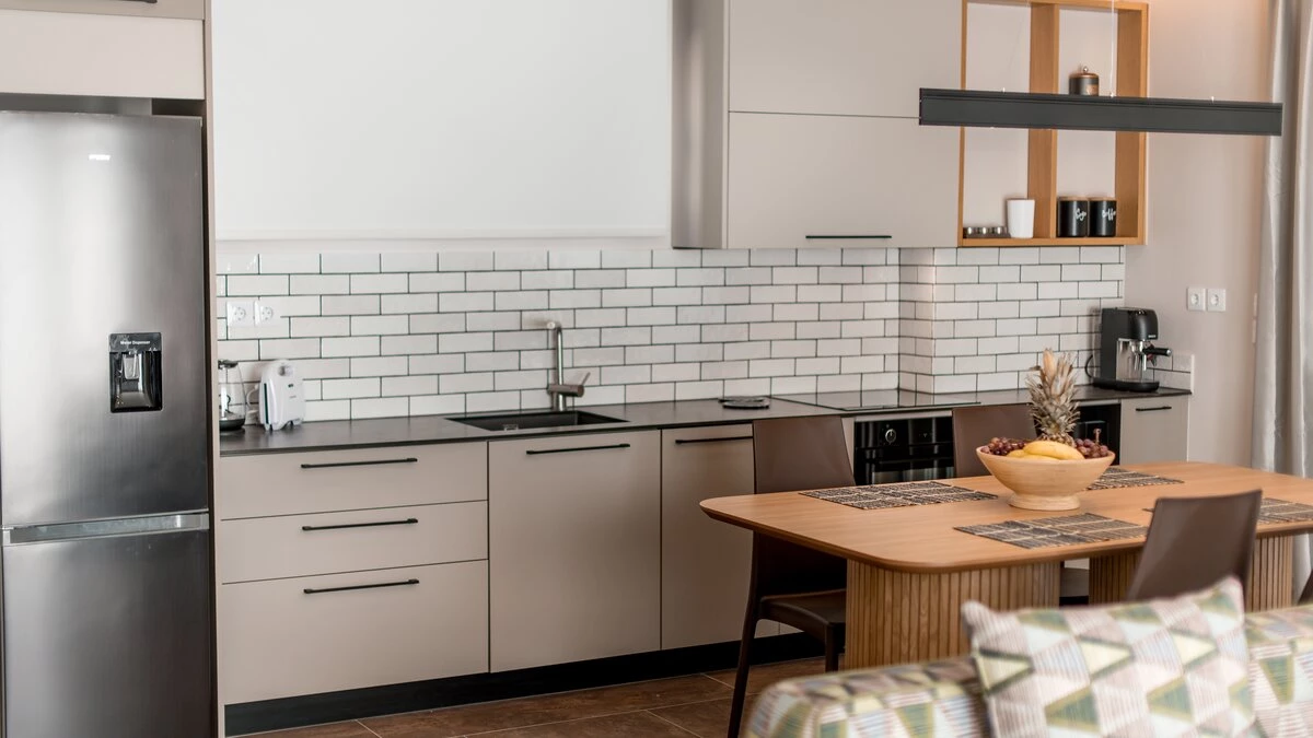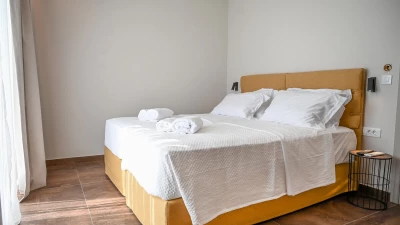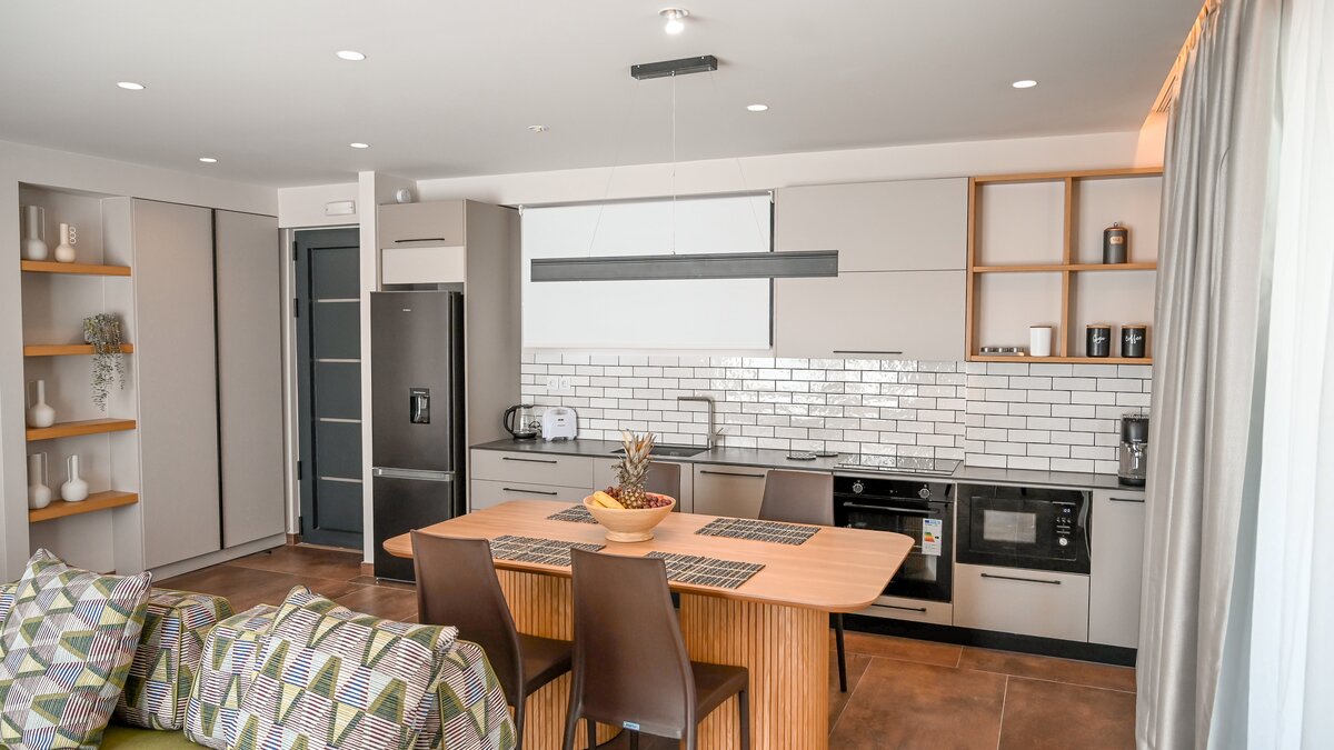 Inside, the villa reveals a carefully orchestrated living space. Polished concrete floors flow beneath floor-to-ceiling windows, the open-plan kitchen features professional-grade appliances and a marble island - ideal for preparing anything from morning coffee to evening cocktails - and the bedrooms are sanctuaries of calm, with premium mattresses, locally sourced linens, and strategic lighting that adapts with the Mediterranean light. Each space feels intentional, stripped of unnecessary decoration but rich in sensory experience.