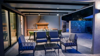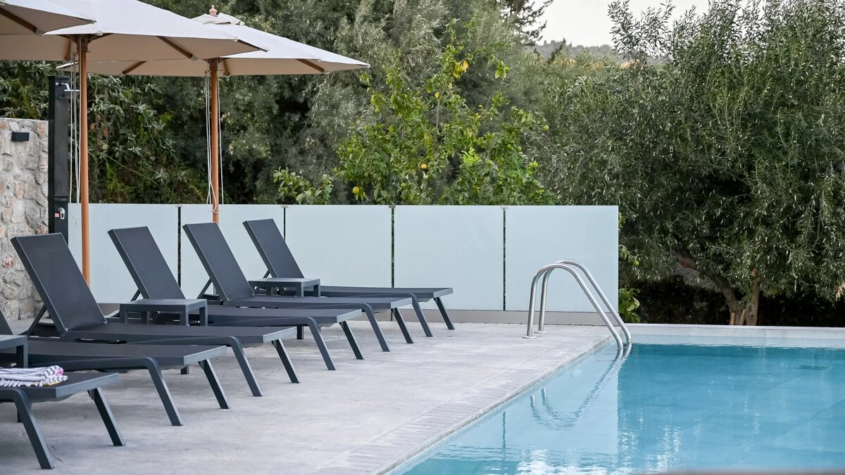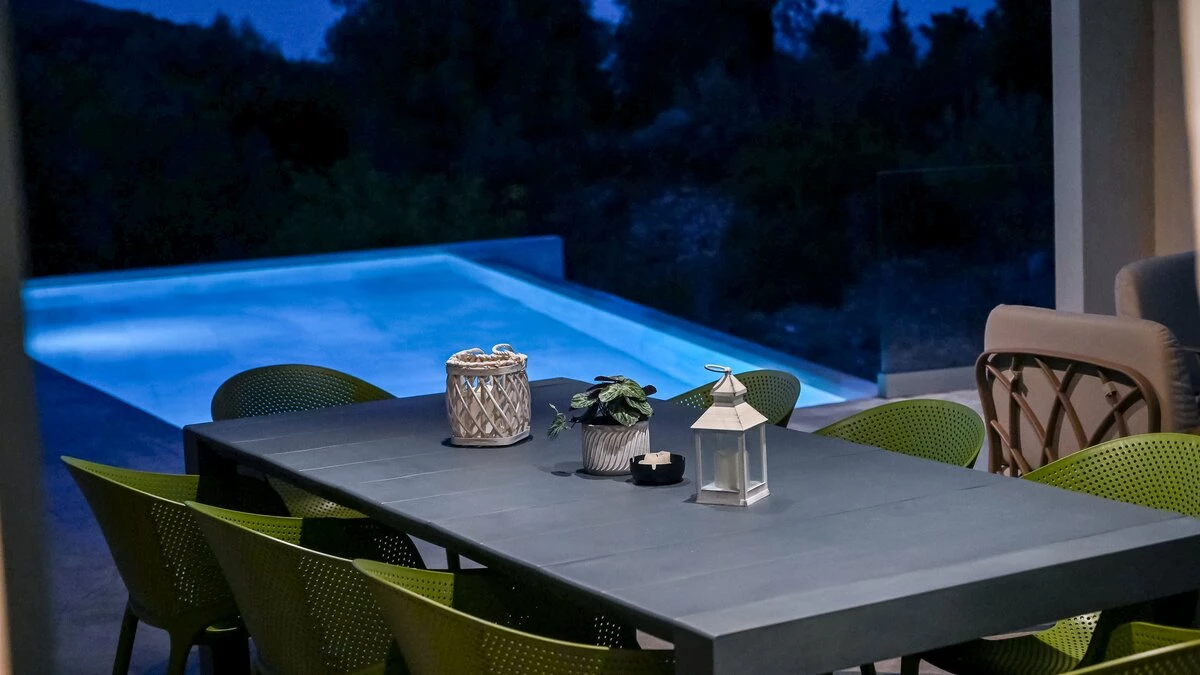 The villa’s exterior transforms Villa Daphne into a private retreat. An infinity pool appears to float above the landscape, its edge dissolving into the sea horizon. Strategically placed seating areas offer multiple perspectives - from full sun exposure to cooler, shaded spots. Mature olive and cypress trees surrounding the villa provide natural screening, ensuring absolute privacy. Located just fifteen minutes from Lefkada town and twenty minutes from some of Greece's most celebrated beaches, Villa Daphne offers an ideal balance of seclusion and accessibility.