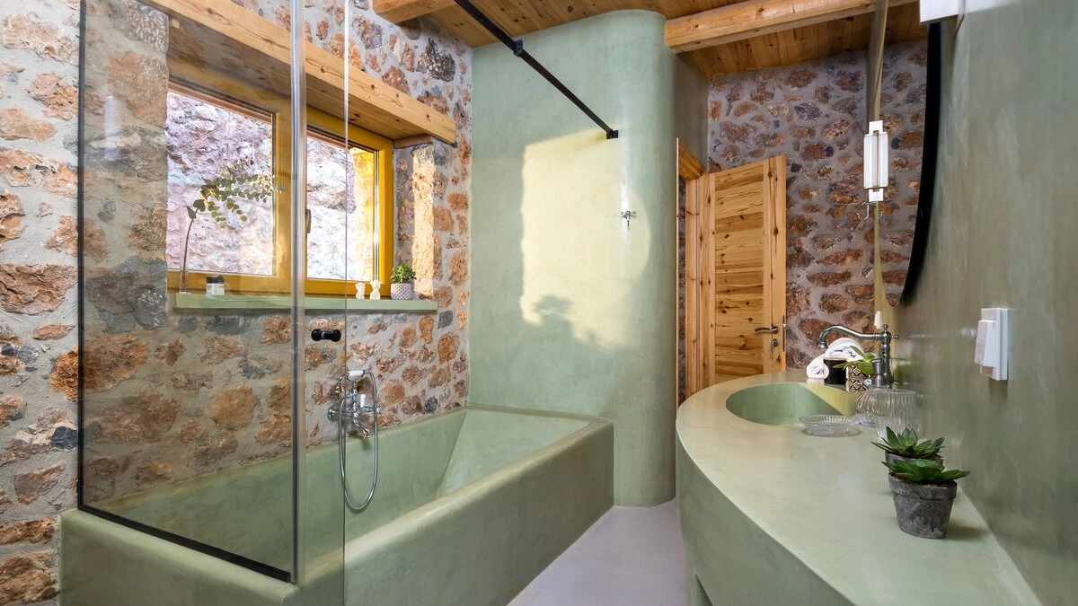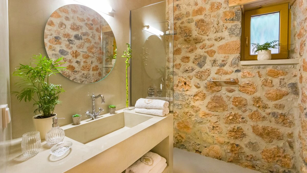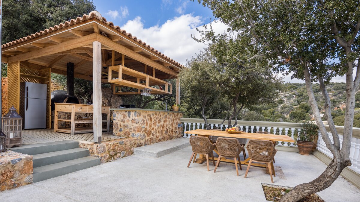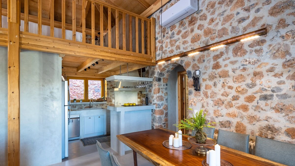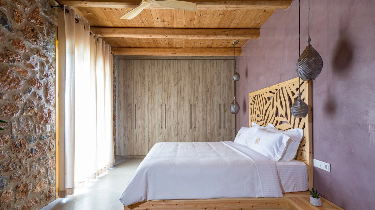 Villa Demeter is a breathtaking property nestled on the slope of the Cretan mountains. The villa is characterised by its stylish decor, as well as its tranquil Mediterranean backdrop. The villa is laid out across one floor with modern minimal aesthetics to provide a luxurious and comfortable holiday experience, including entirely wooden furniture and stone walls. The open plan living, dining and kitchen area is incredibly spacious and provides the perfect spot for relaxing and eating after a day exploring the area. The kitchen is fully equipped, whilst the living area includes an extravagant chandelier hanging over the supersized sofa. A small office space with a desk and stool is located by the entrance of the living room. The master bedroom is spacious and airy, designed with a bathroom en suite, cosy neutral tones and direct access to the terrace. The two double bedrooms are similarly furnished, with amazing views of the mountains and a serene feel.