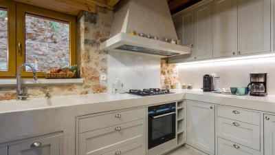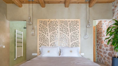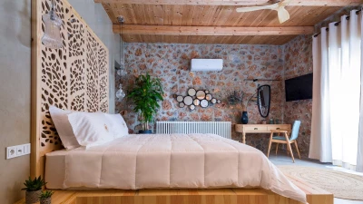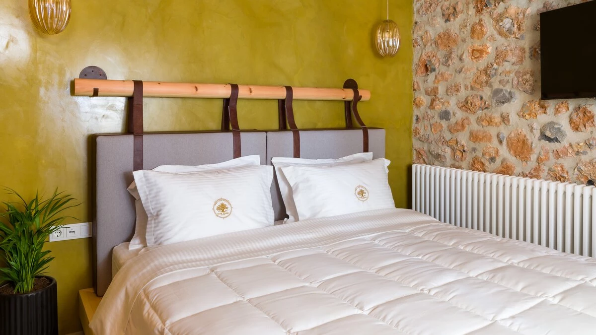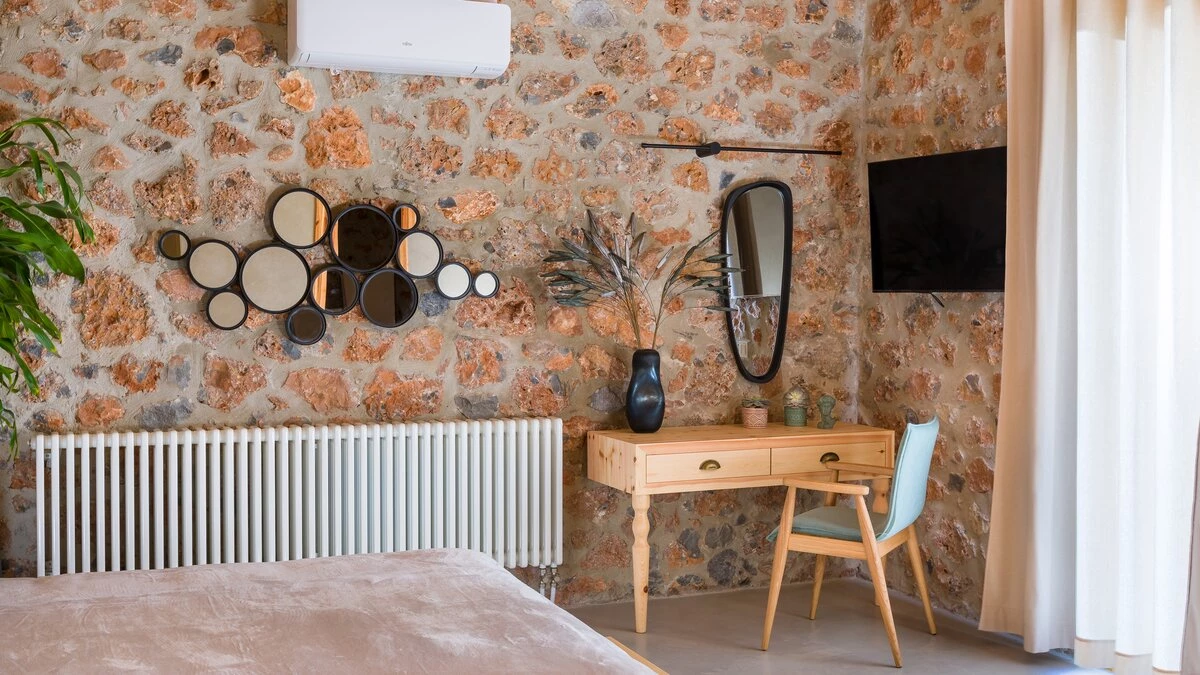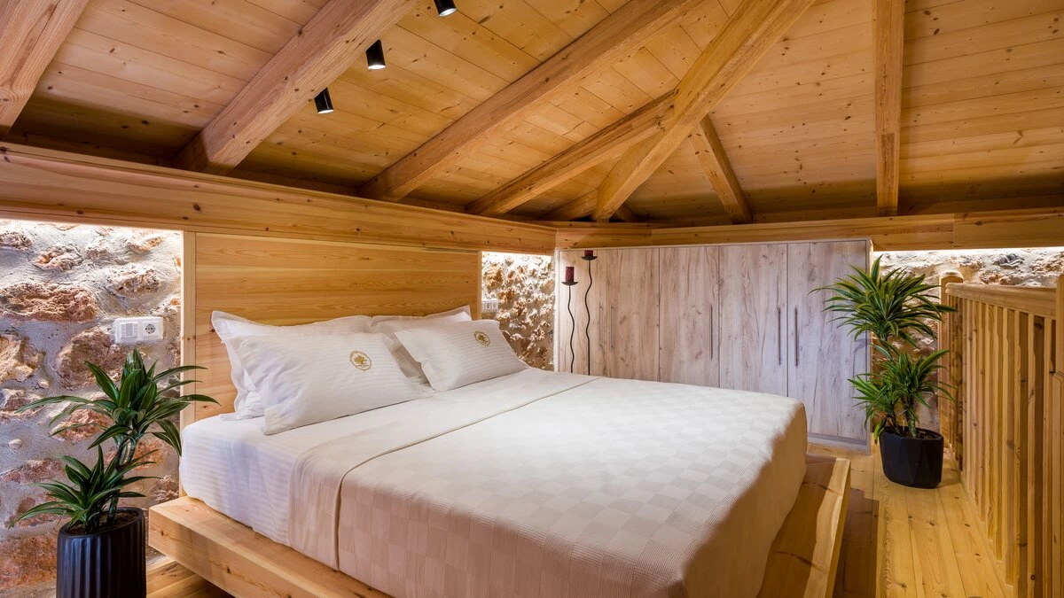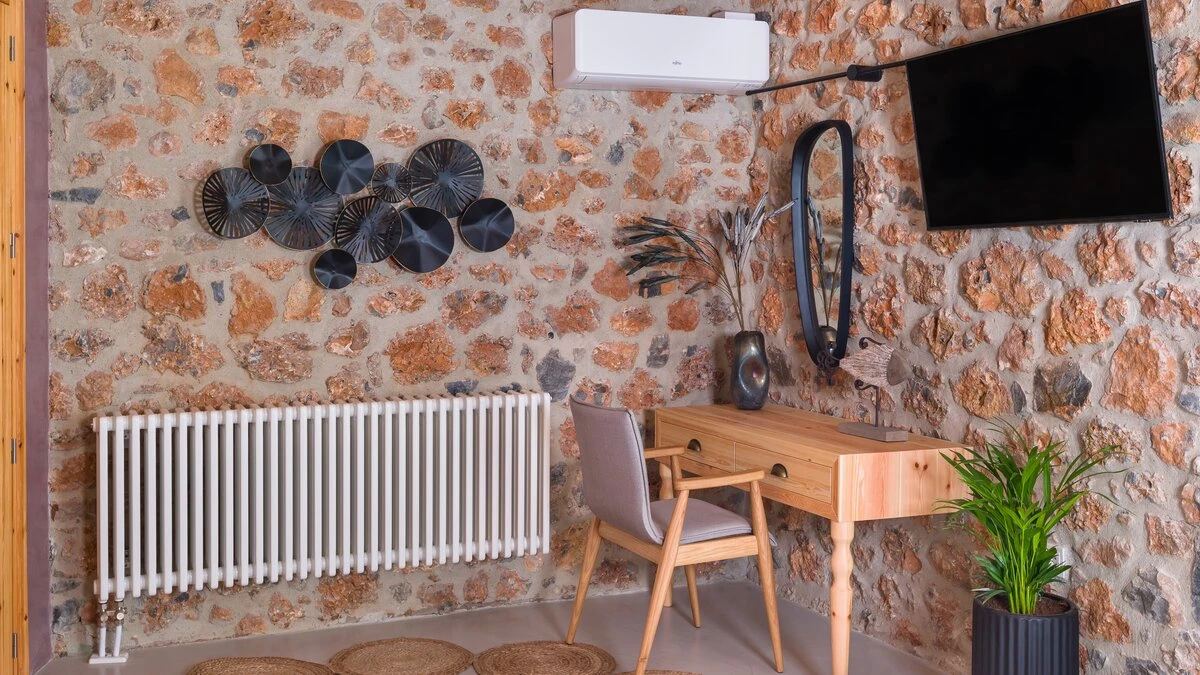 Villa Demeter is a breathtaking property nestled on the slope of the Cretan mountains. The villa is characterised by its stylish decor, as well as its tranquil Mediterranean backdrop. The villa is laid out across one floor with modern minimal aesthetics to provide a luxurious and comfortable holiday experience, including entirely wooden furniture and stone walls. The open plan living, dining and kitchen area is incredibly spacious and provides the perfect spot for relaxing and eating after a day exploring the area. The kitchen is fully equipped, whilst the living area includes an extravagant chandelier hanging over the supersized sofa. A small office space with a desk and stool is located by the entrance of the living room. The master bedroom is spacious and airy, designed with a bathroom en suite, cosy neutral tones and direct access to the terrace. The two double bedrooms are similarly furnished, with amazing views of the mountains and a serene feel.