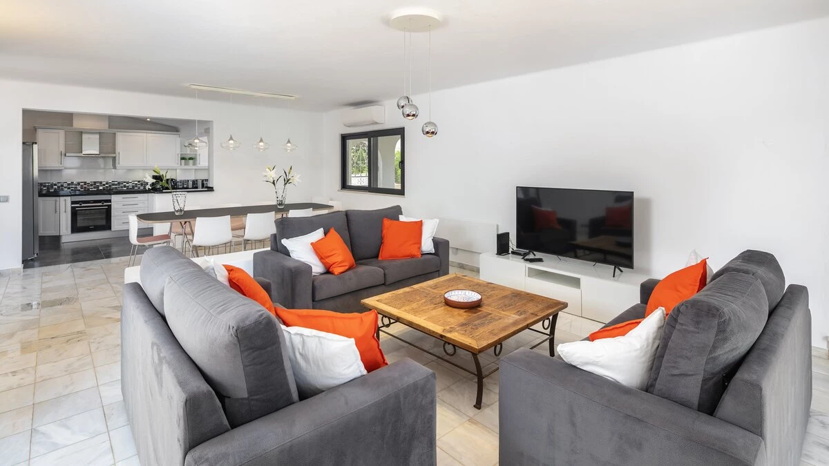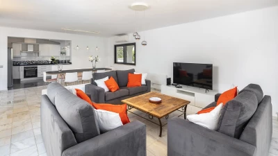 Villa Dulce beautifully blends elegance with functionality across its expansive living spaces. The downstairs area is a testament to sophisticated design, featuring a spacious living room furnished with plush seating and modern décor. Large windows bathe the room in natural light and offer picturesque views of the garden. Adjacent to this inviting space is an open-plan kitchen, fully equipped with state-of-the-art appliances and generous counter space. The dining area overlooks the garden, providing a perfect setting for intimate dinners or entertaining guests. On this level, three double bedrooms offer comfort and privacy. One bedroom boasts an en suite shower room, while the other two share a stylish shower room, making the villa an ideal choice for multi-generational families.