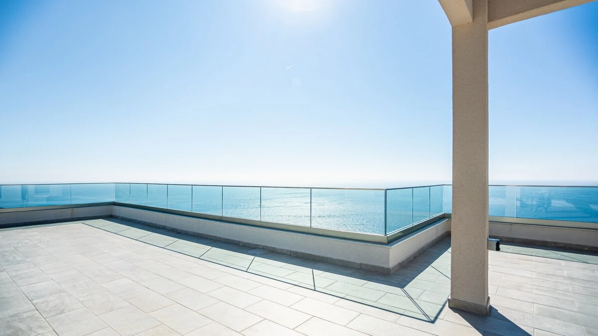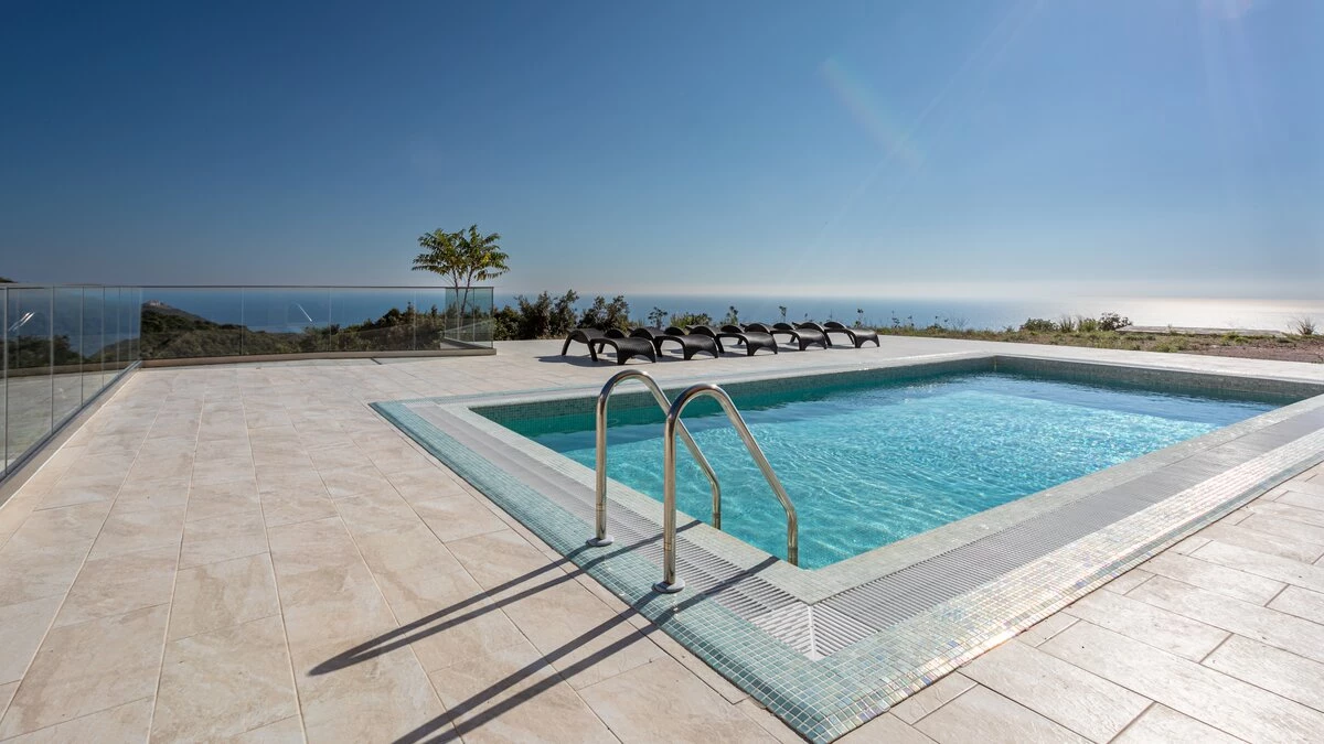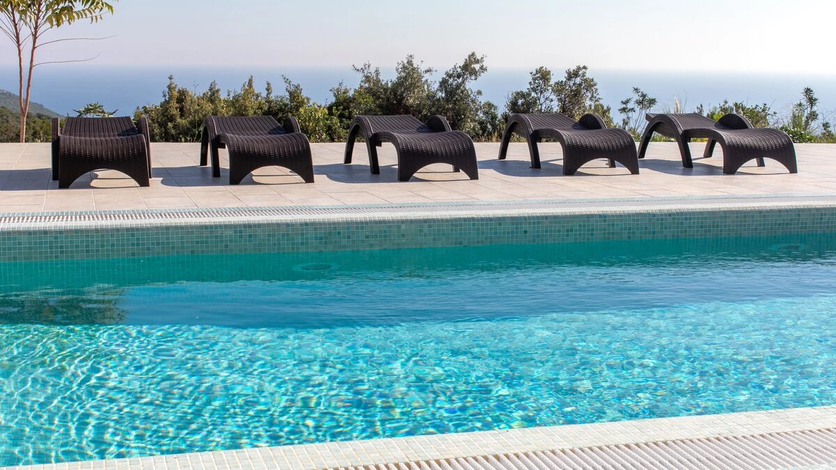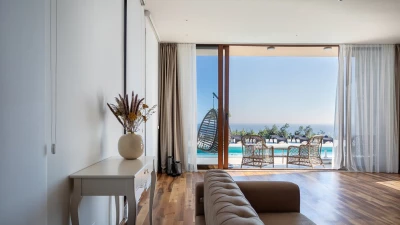 Outside, expansive sea-facing terraces frame a private pool and built-in barbecue, setting the scene for sun-drenched days and elegant al fresco dining.
