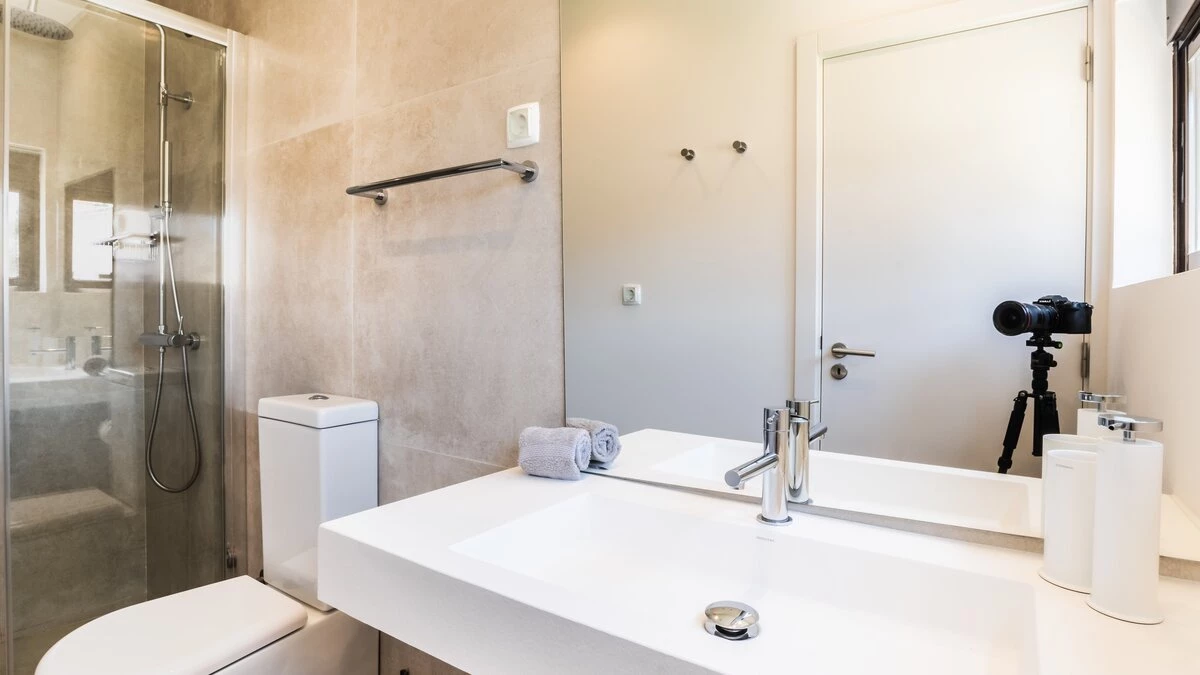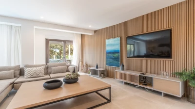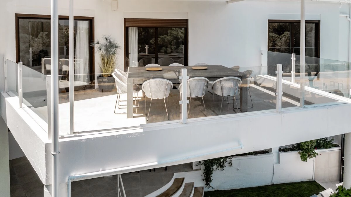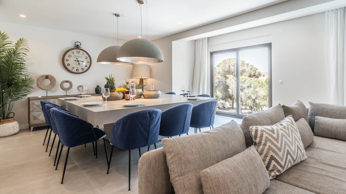 The villa's interiors are a masterpiece of contemporary design, featuring a state-of-the-art modern aesthetic that seamlessly blends comfort with sophistication. Cream and pastel tones create a serene atmosphere, complemented by chic décor and elegant furnishings. The spacious open-plan living area boasts large, inviting sofas and an expansive dining space that effortlessly flows onto the external terrace. Each of the five en-suite bedrooms has been carefully crafted to provide maximum comfort, with four double rooms and one twin room offering ample space and privacy for guests.