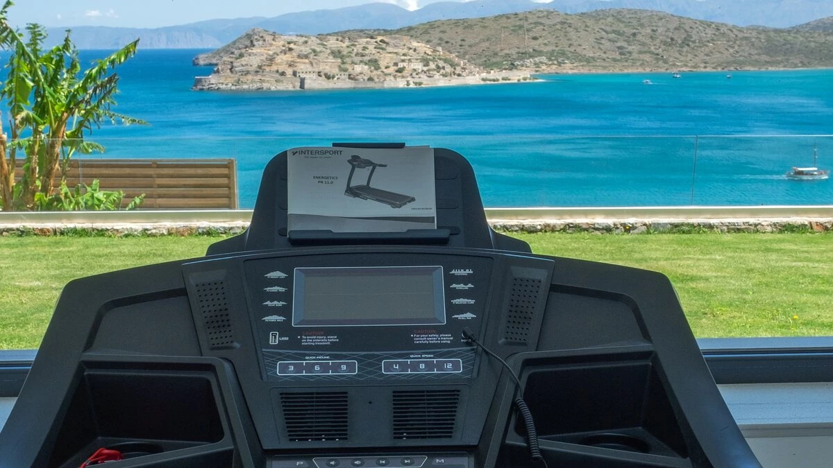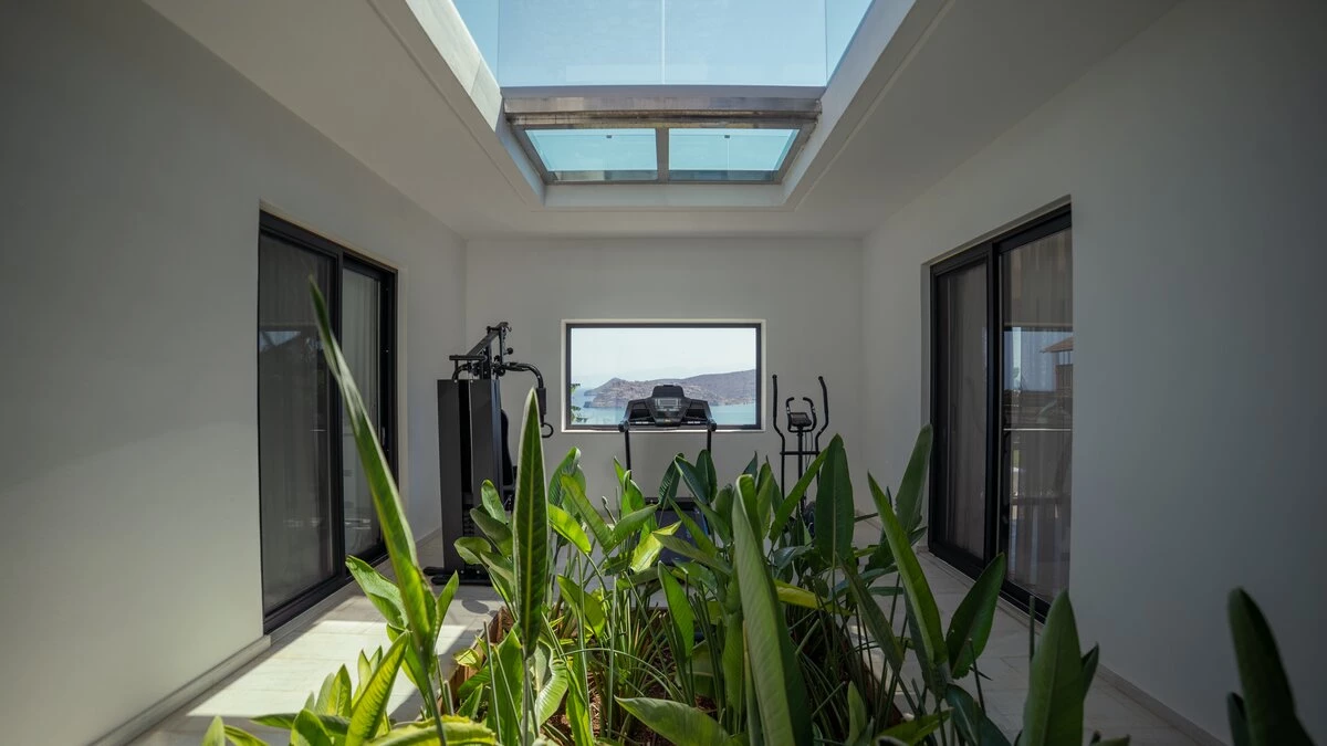 Spacious and modern Villa Gaea is a lovely family villa in Crete, perfectly poised to enjoy sweeping views of the ocean and Spinalonga Island. Inside, a large living, dining and kitchen space is beautifully designed in blue hues, looking out onto the ocean. Head upstairs to discover two double bedrooms with a bathroom en suite, opening onto a balcony with incredible views. The lower ground floor includes four more lovely bedrooms, two of which include an en suite, a sitting area and a great selection of gym equipment.