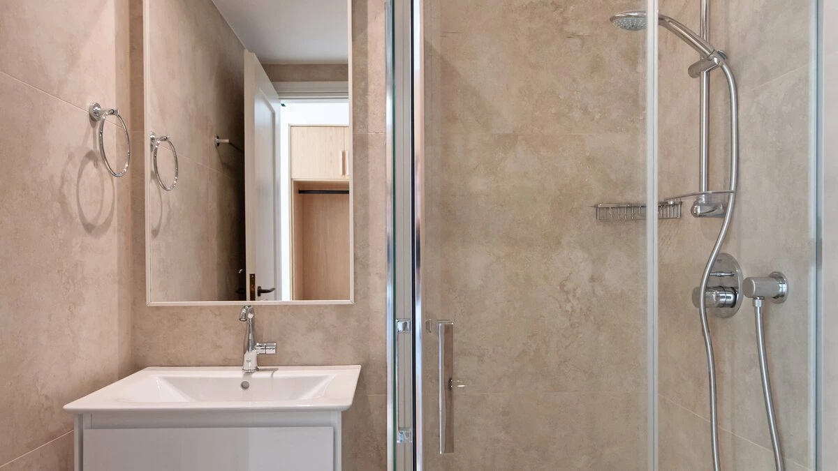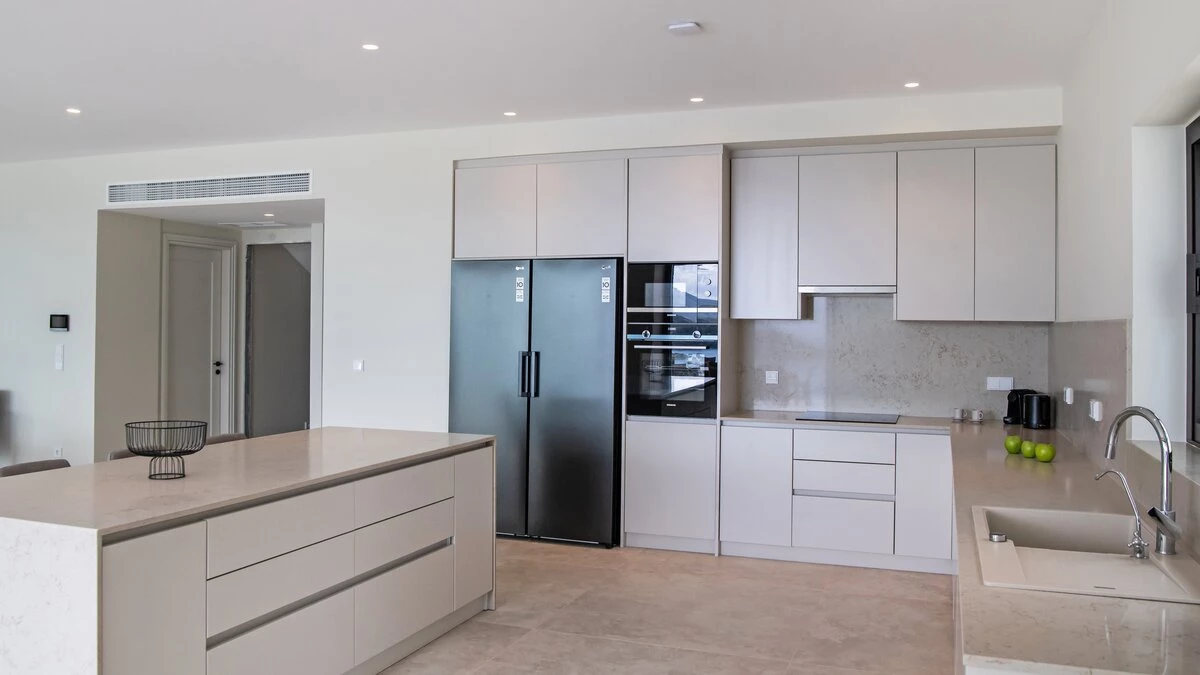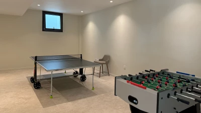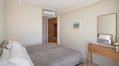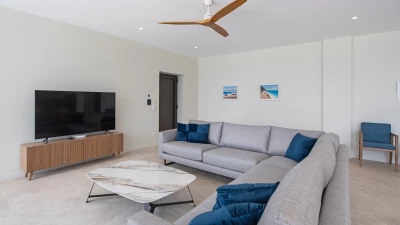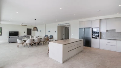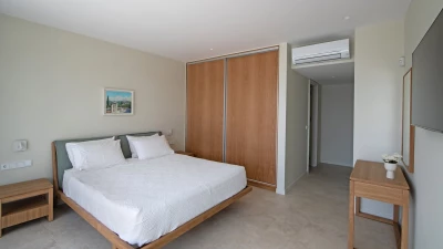 The first floor of the villa is home to all six bedrooms, each featuring a private en suite. The rooms are adorned with custom-crafted solid oak furniture and luxurious natural-textured fabric furnishings, adding a truly distinctive touch to the villa, with every bathroom featuring its own walk-in shower. The villa adopts a very light and airy ambiance, with the ground floor’s open plan living room and kitchen area with a breakfast bar opening out onto the terrace, an ideal spot for a meal with a view at any time of day.