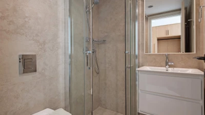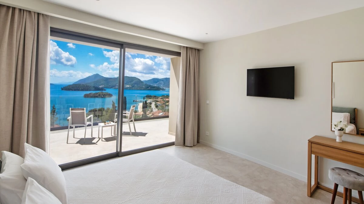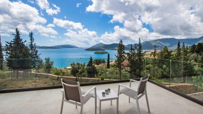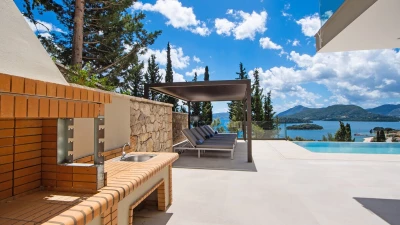 Nestled in a quiet olive grove on the hillside, this newly-built villa guarantees incredible, calming views of the Ionian Sea, within walking distance of the neighboring town of Nidri and just five hundred meters from the stunning Passa beach, known for its emerald waters and relaxing nature.