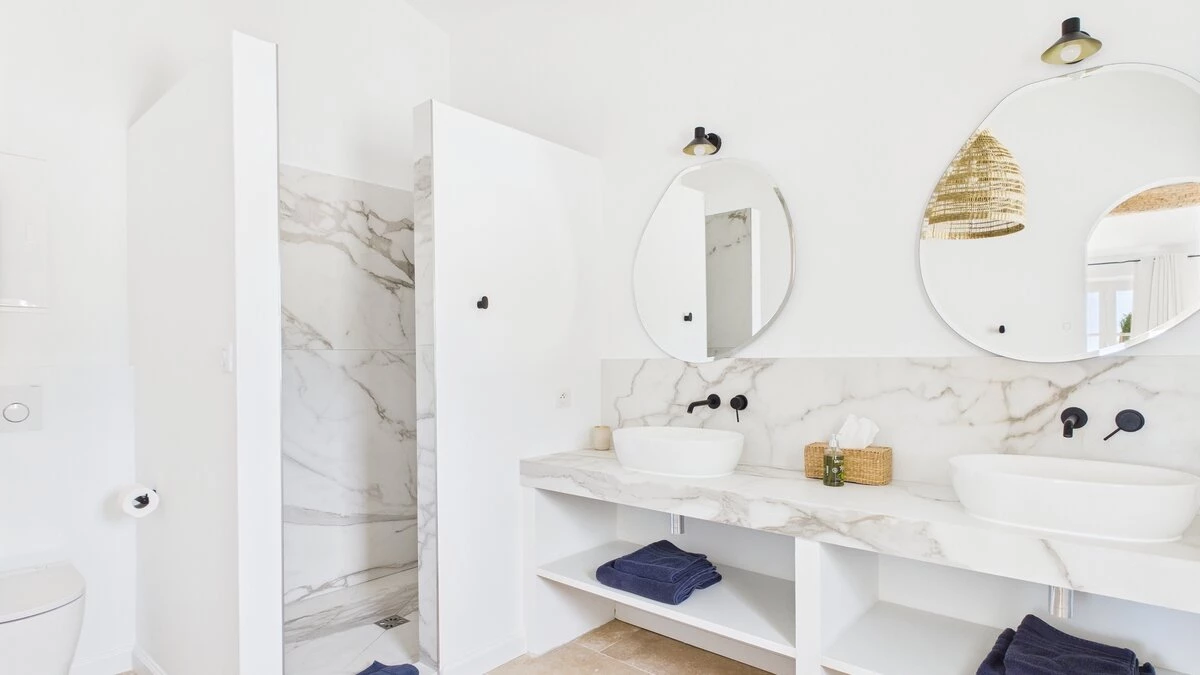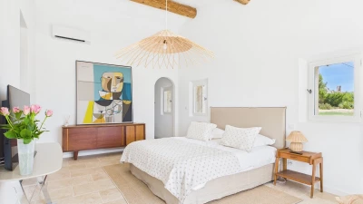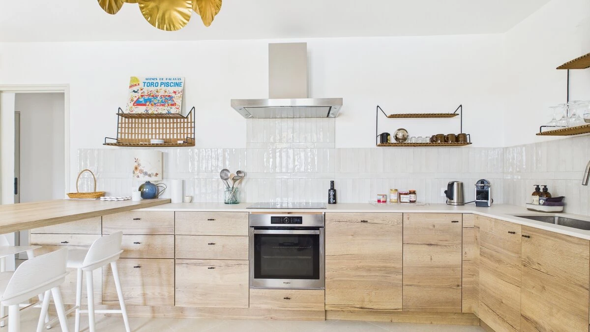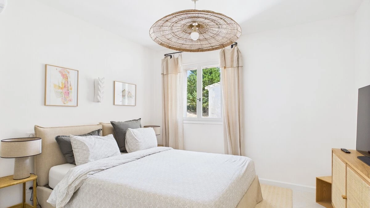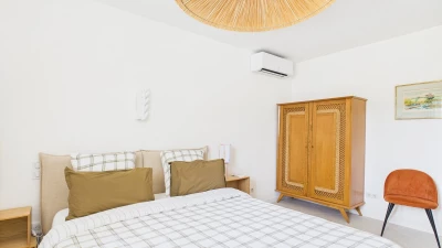 Designed for relaxed living, the villa flows effortlessly from indoors to out. The open-plan kitchen is fully equipped for easy self-catering, whether you’re preparing simple breakfasts or lunches with fresh local produce, and leads into a welcoming dining area and light-filled living space, both opening directly onto the garden. All accommodation is on one level, making the layout particularly appealing for families or couples seeking comfort and ease.