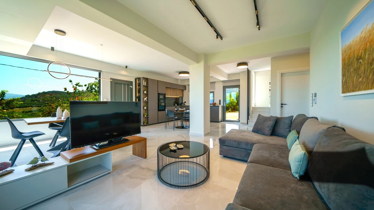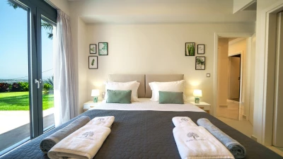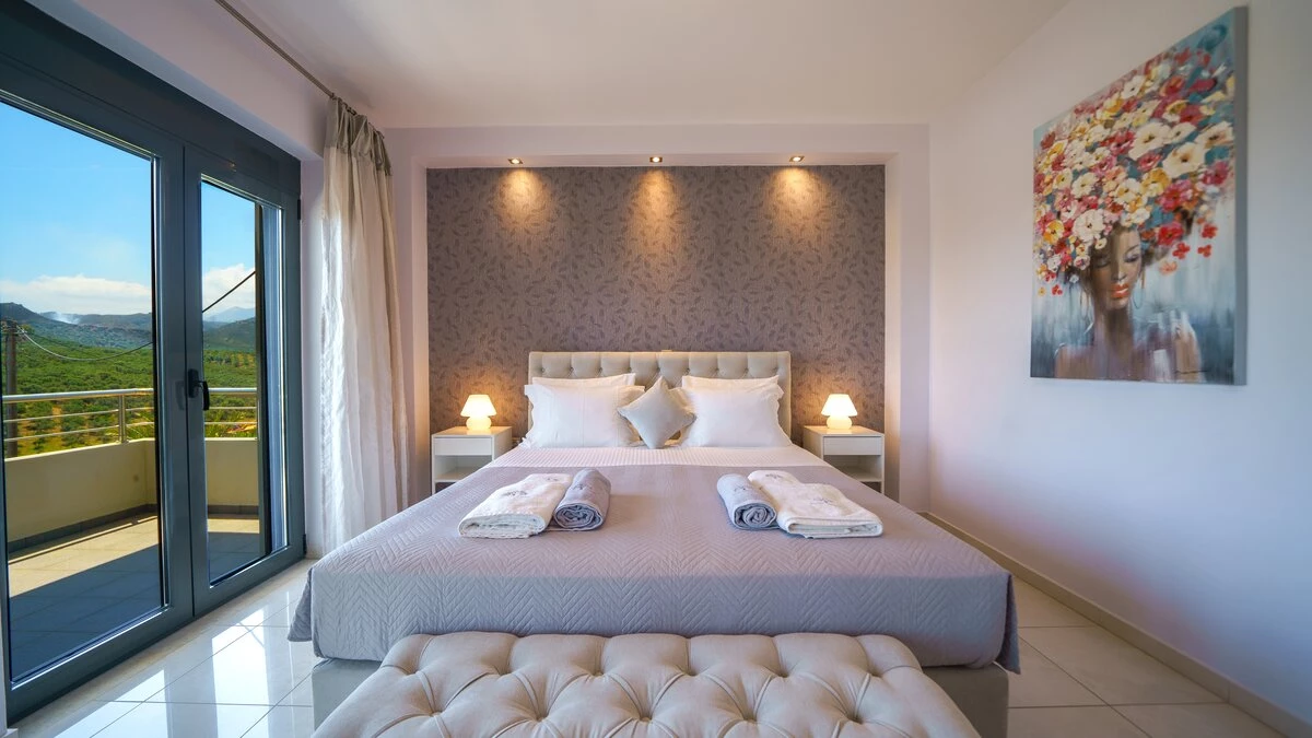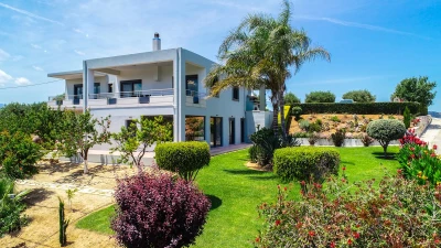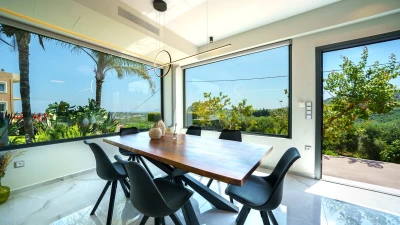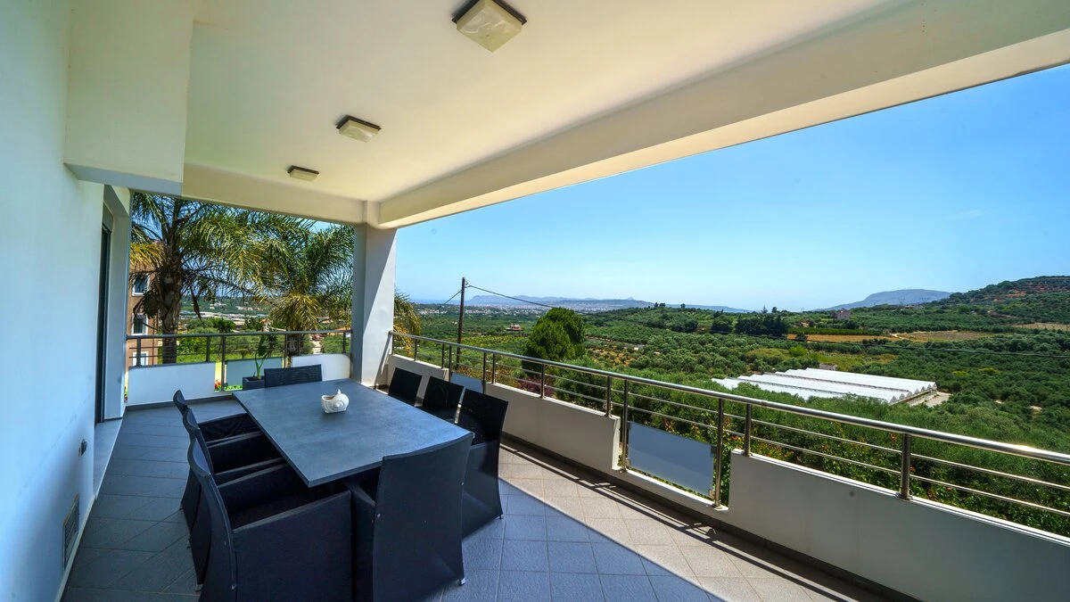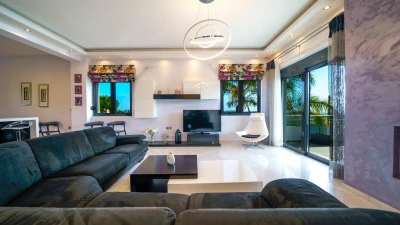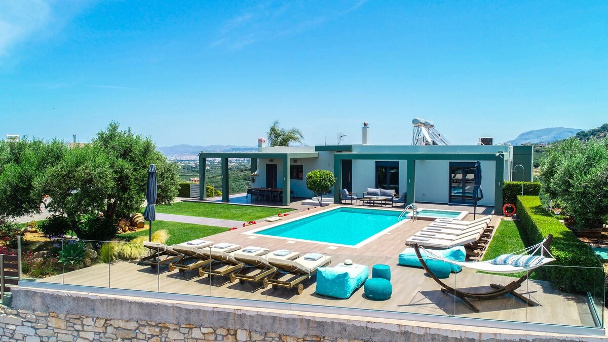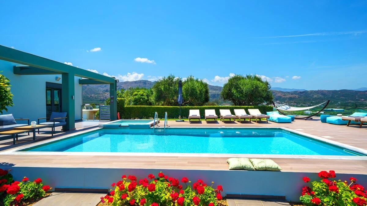 Nestled atop a serene hill in Potistiria, just 5 km from Chania's vibrant city center, Villa Danai  offers a stylish retreat surrounded by ancient olive groves. This expansive villa seamlessly blends traditional Cretan charm with modern elegance, providing an idyllic setting for families or groups seeking both relaxation and proximity to Crete's renowned attractions. With panoramic views of the sea, mountains, and countryside, the villa promises an unforgettable Mediterranean escape.
