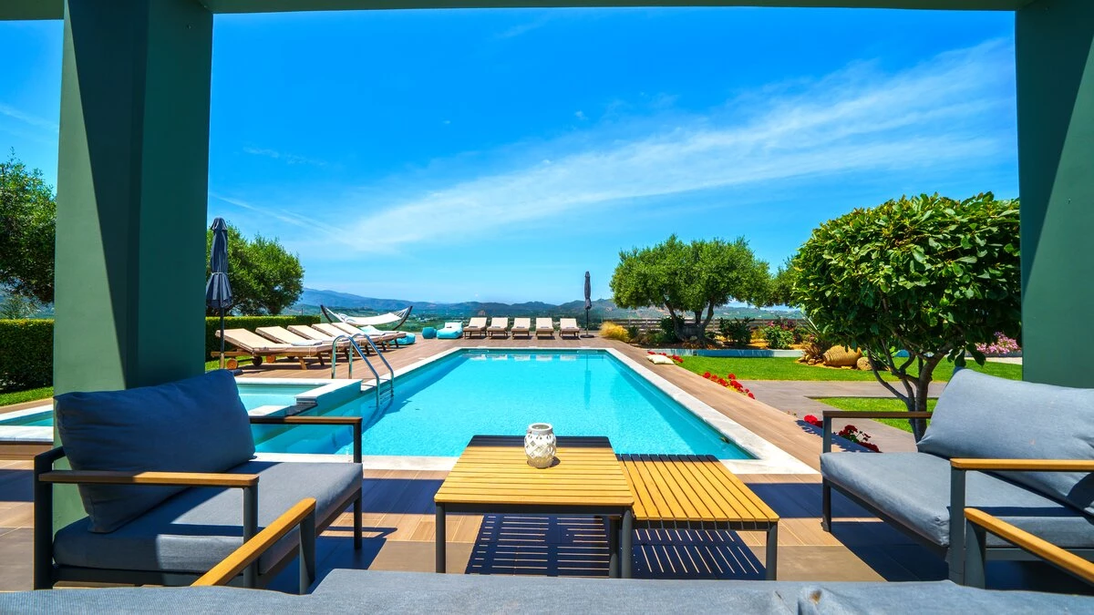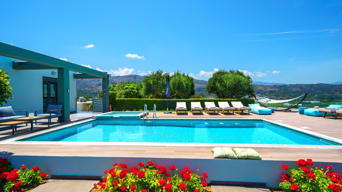 A spacious hilltop retreat near Chania, Villa Ida blends traditional charm with refined comfort, offering panoramic views, a heated pool, and room for thirteen guests to relax in style.