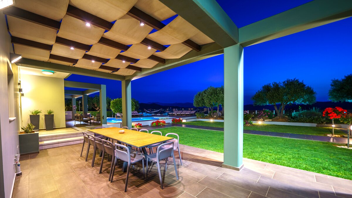 Step outside to discover a private oasis designed for leisure and entertainment. The villa's landscaped grounds feature a heated 12-meter swimming pool, a separate children's pool, and ample sun loungers for soaking up the Cretan sun. A shaded pergola houses an al fresco dining area and a built-in barbecue, perfect for evening gatherings. Children can enjoy the on-site playground, while adults might indulge in a game of table tennis or simply relax in the hammock, all set against the backdrop of beautiful natural vistas.