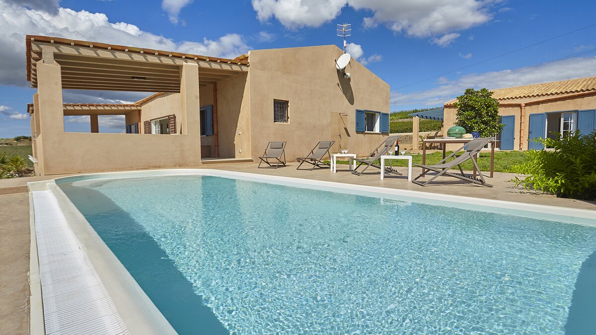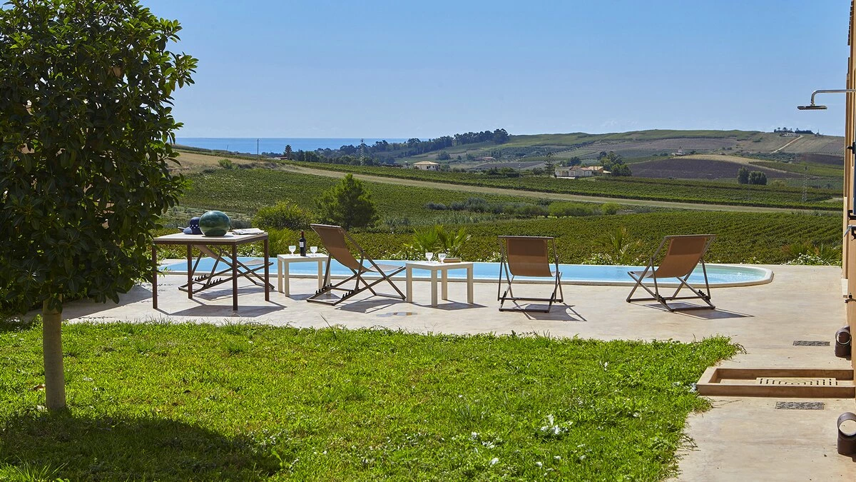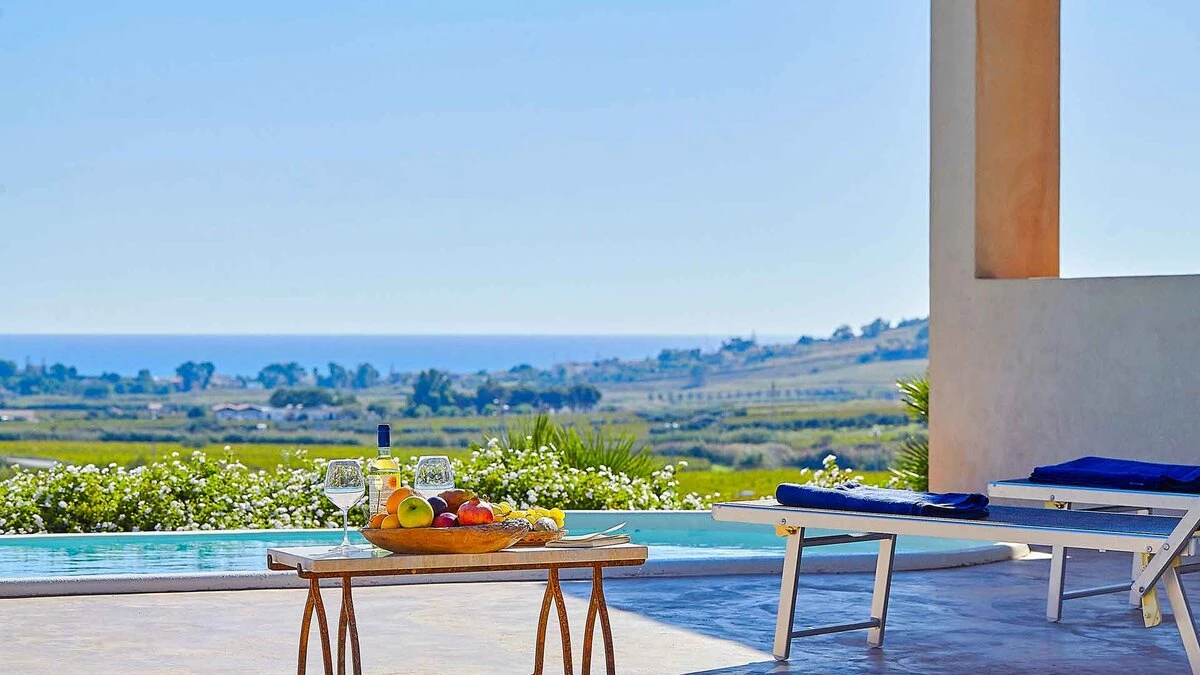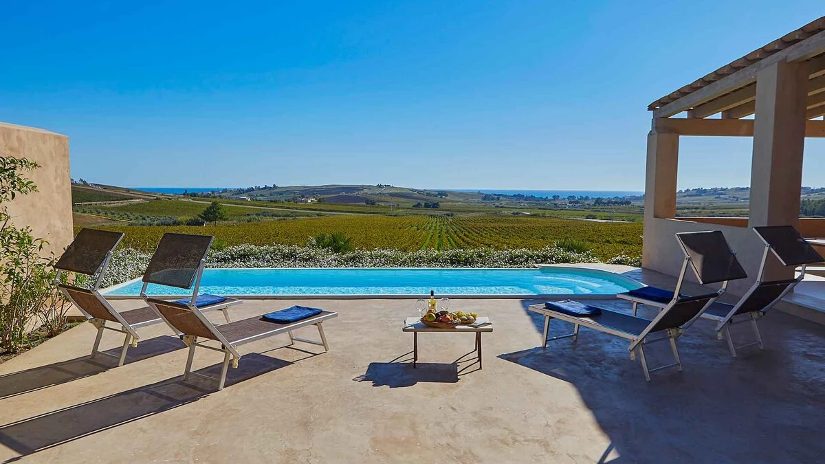 This, in turn, leads into the smart and modern kitchen, and all three rooms open out to wrap-around terraces with covered areas furnished for al fresco dining and relaxing. Two bedrooms in the main house include the four-poster master suite, and there are two rooms in the annexe, each flexibly furnished for twin or double use, and both with French doors to a lawned area just behind the swimming pool, where deck chairs furnish a sizeable sun terrace with scenic views to the sea. This is where some of Sicily's loveliest beaches and clearest waters can be found and some of the island's finest wineries - just a few hundred metres from the property are the vineyards of the famous Planeta winery and at 200metres their renowned La Foresteria Planeta restaurant.