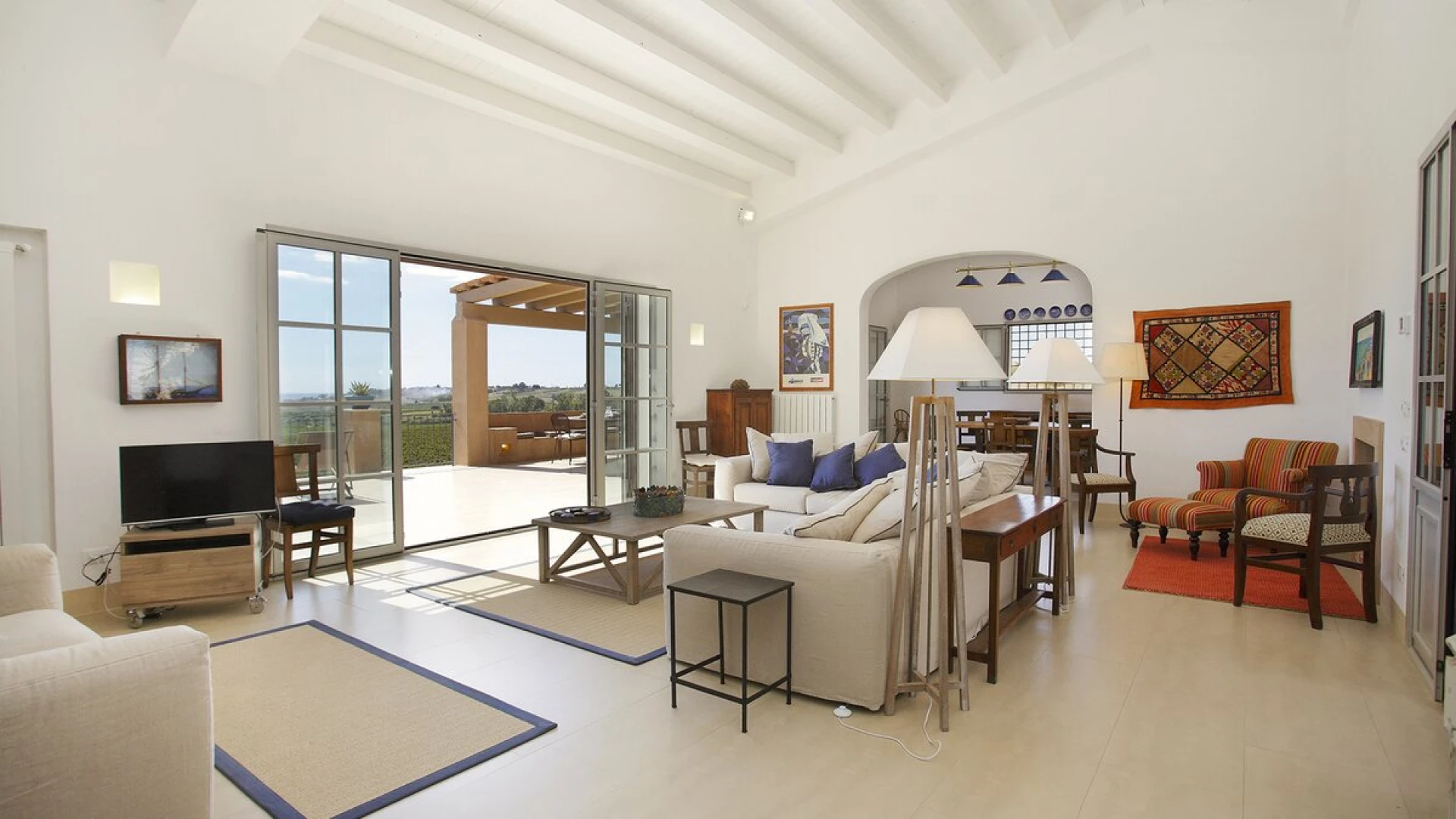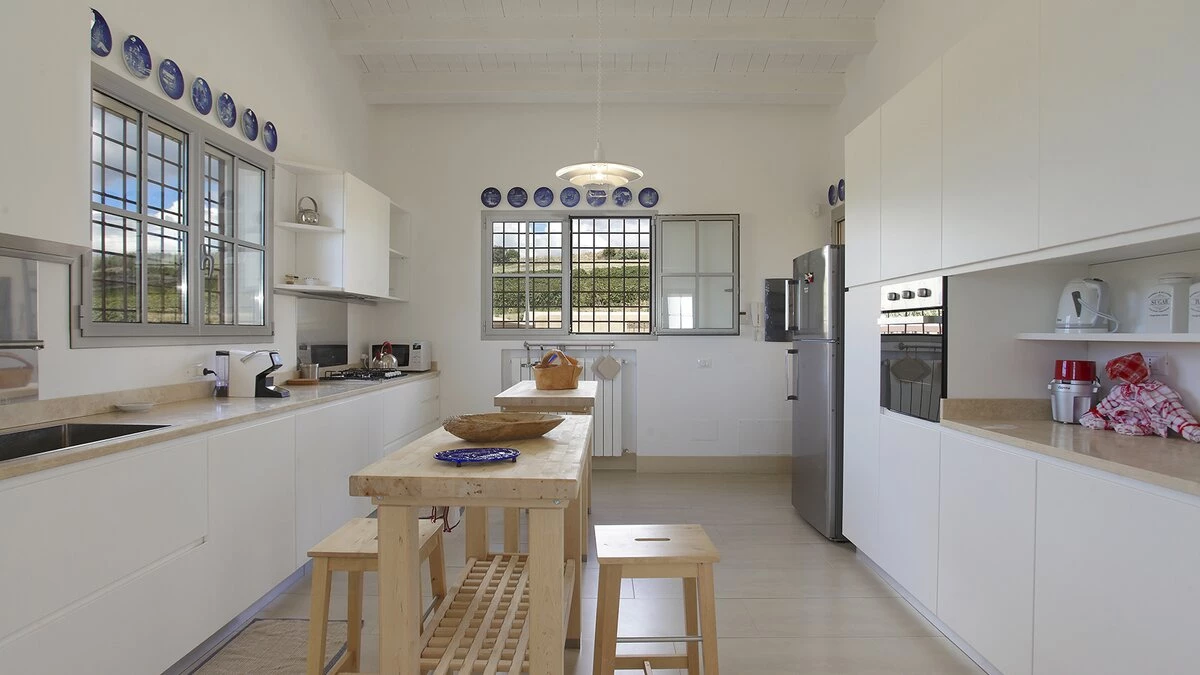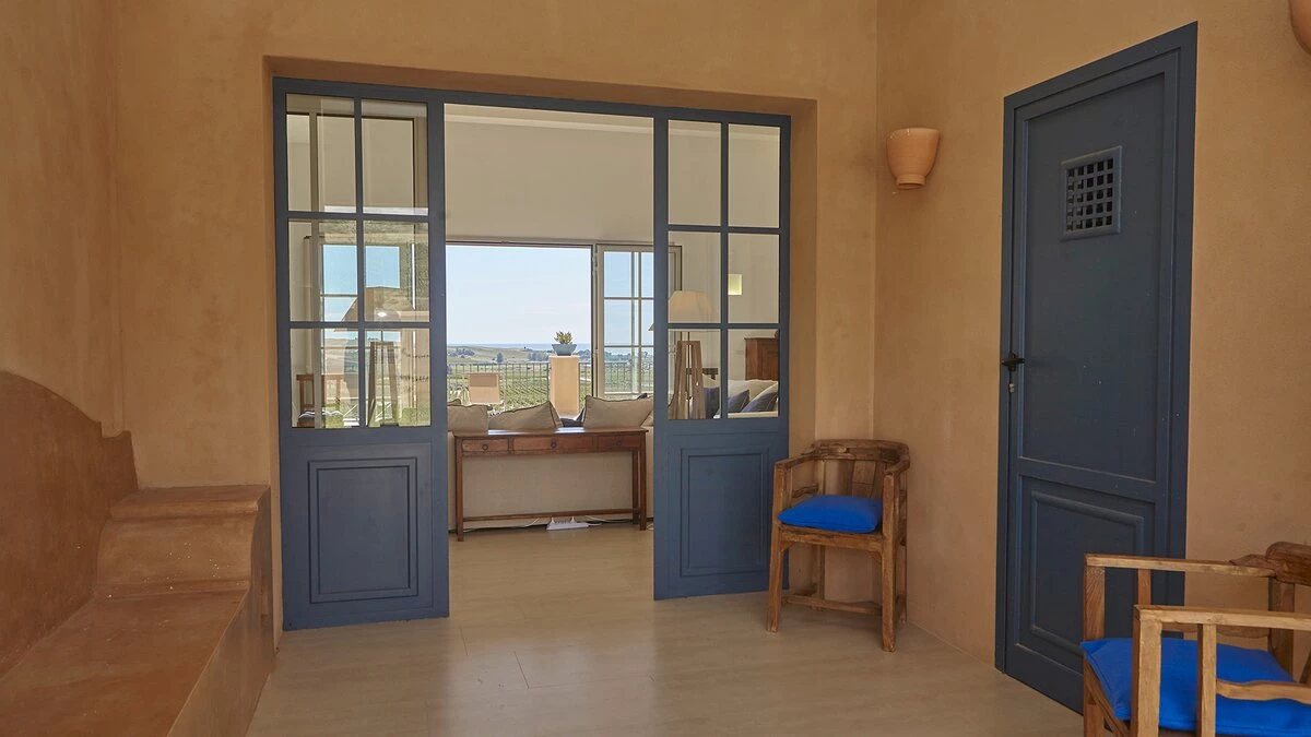 Combining undisturbed countryside with easy access to the coast, the spacious Villa Inzolia is peacefully positioned in the island’s north-western corner, just 2km from shops and restaurants in Portopalo di Menfi, and 2.5km from a gorgeous sandy beach. Thoughtfully designed to incorporate character with contemporary style, the house has all the usual mod-cons from air conditioning to WiFi, while its cool toned décor is splashed with colour from bright rugs and fabrics. Comprising two single-storey buildings, the villa’s main house has a stylish and airy sitting room with whitewashed beams, a fireplace and open access to the dining room.