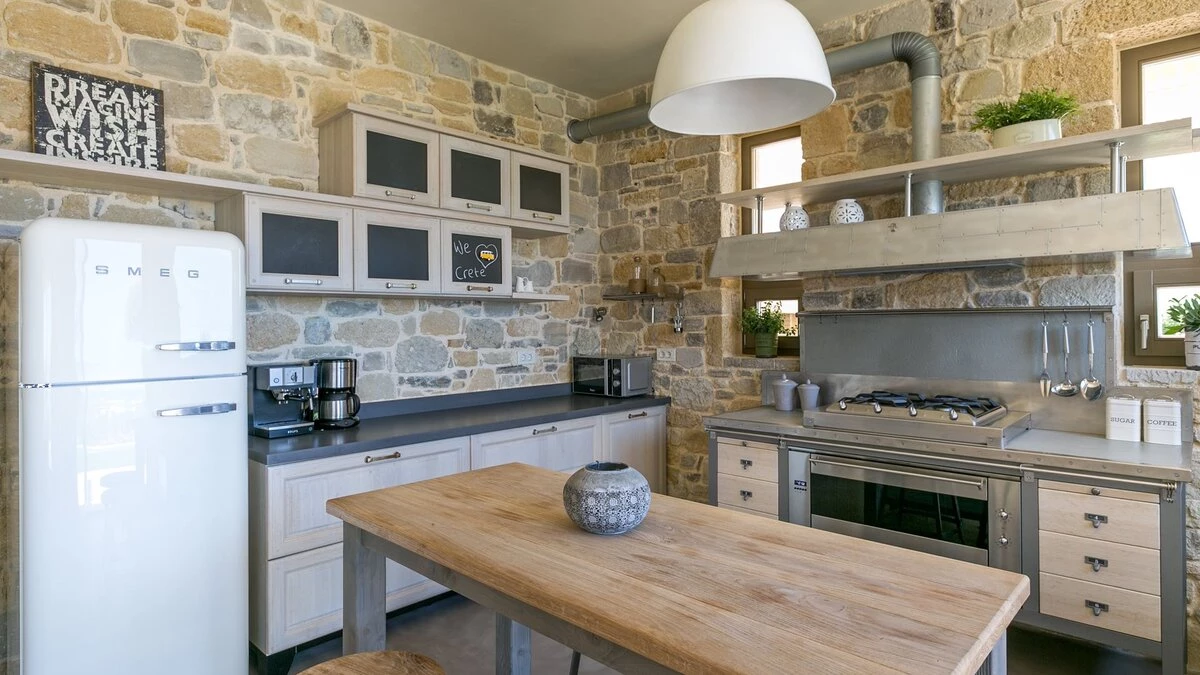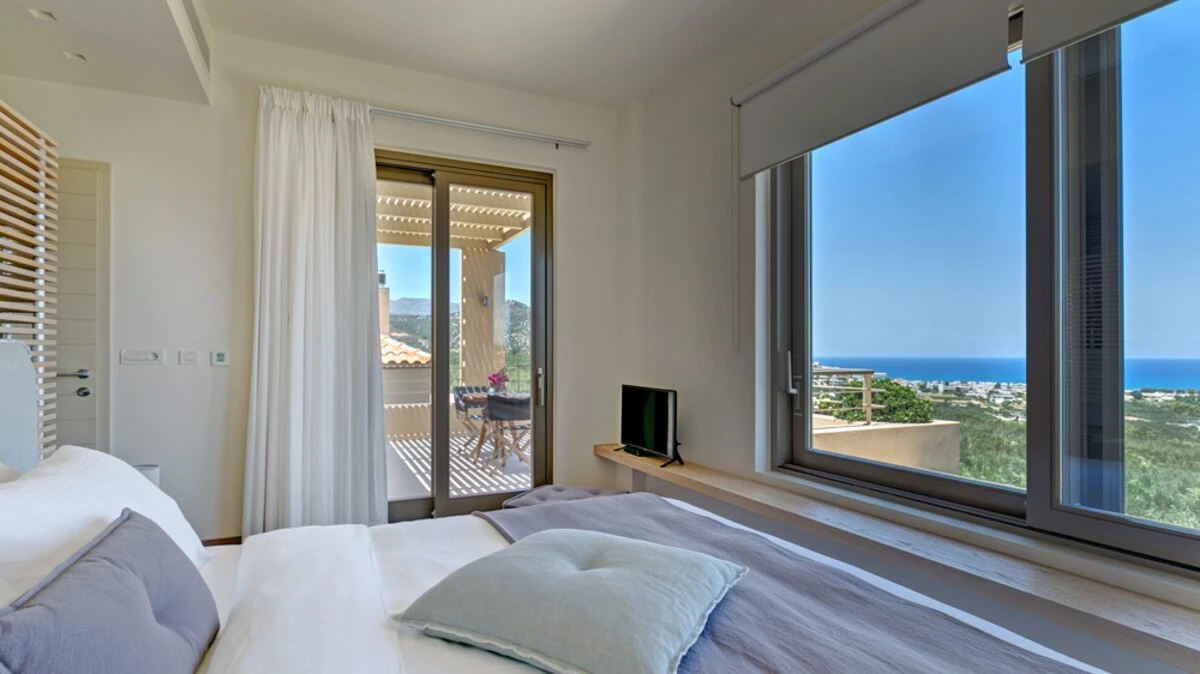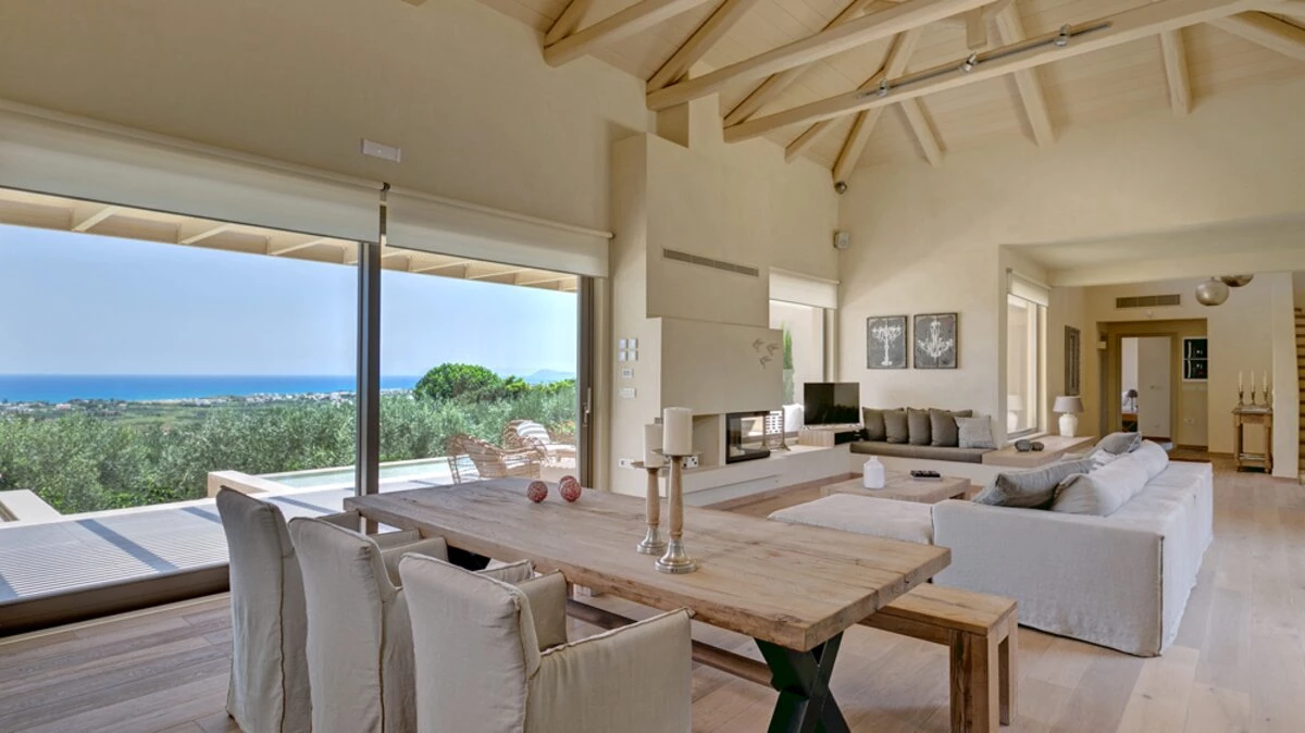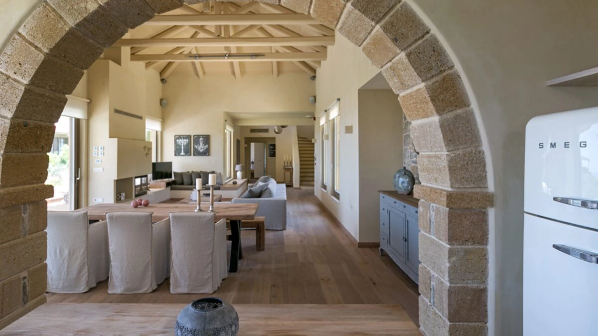 Uncluttered, understated and uber-chic, this very contemporary house stands in three hectares of gated grounds, just 1.5km from shops and waterfront restaurants in Kolymvari village and 2km from its long sand and pebble beach.  A haven of peace and luxury, the villa’s stylish rooms feature oak floors, exposed stone walls, high raftered ceilings, and décor and furnishings in soft earthy tones; while its exceptional facilities include a light and airy gym, and a vaulted stone wine cellar replete with Greek and Cretan wines. The living area is a lovely open-plan arrangement in which a cool retro kitchen, well equipped with modern appliances, adjoins a serene and spacious sitting / dining room with a window wall onto wonderful views.