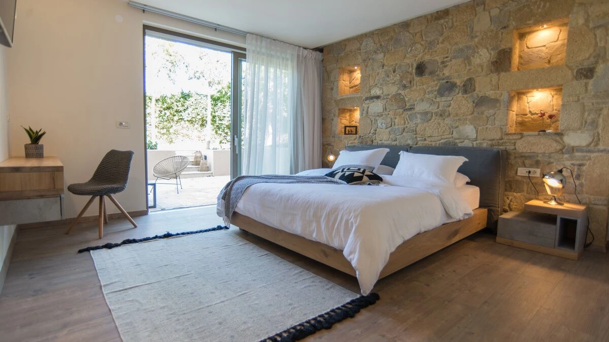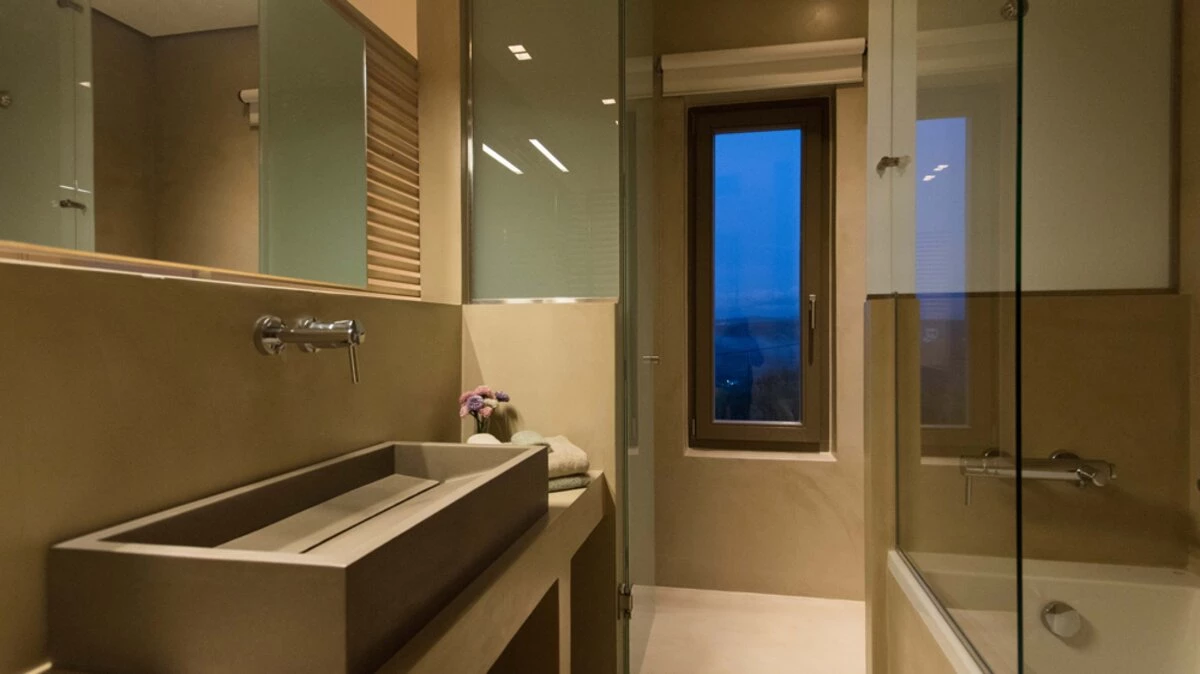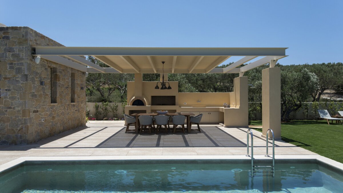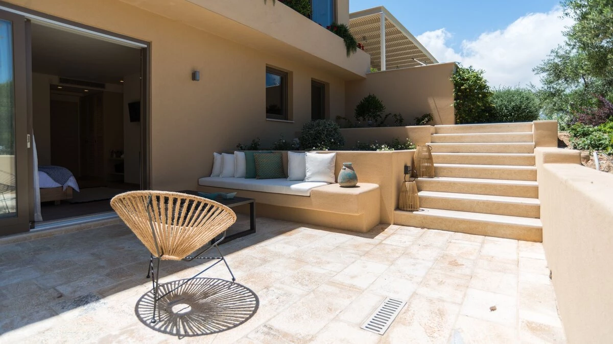 Uncluttered, understated and uber-chic, this very contemporary house stands in three hectares of gated grounds, just 1.5km from shops and waterfront restaurants in Kolymvari village and 2km from its long sand and pebble beach.  A haven of peace and luxury, the villa’s stylish rooms feature oak floors, exposed stone walls, high raftered ceilings, and décor and furnishings in soft earthy tones; while its exceptional facilities include a light and airy gym, and a vaulted stone wine cellar replete with Greek and Cretan wines. The living area is a lovely open-plan arrangement in which a cool retro kitchen, well equipped with modern appliances, adjoins a serene and spacious sitting / dining room with a window wall onto wonderful views.