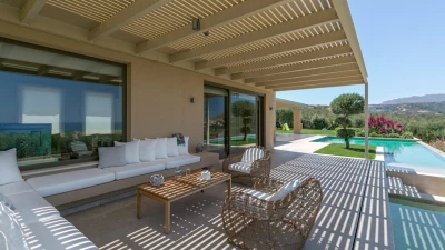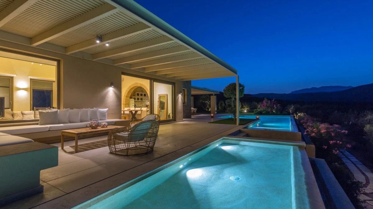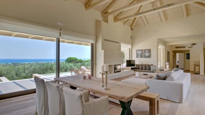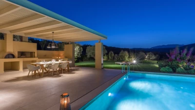 Stylish design brings cosmopolitan chic to the countryside at this luxury villa with two pools, gym and wine cellar. Wide open views of the sea and mountain add to its innate serenity.
