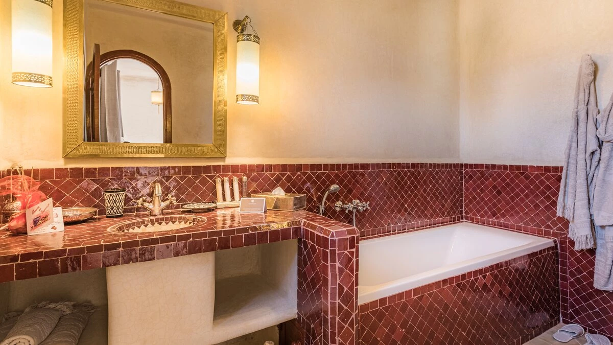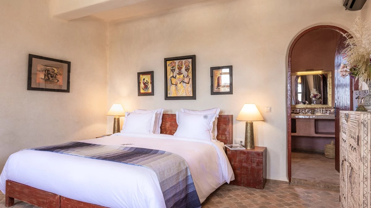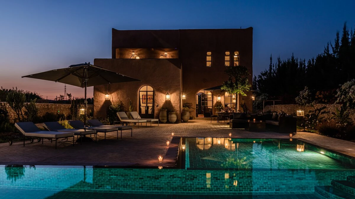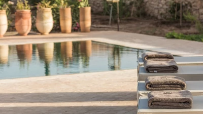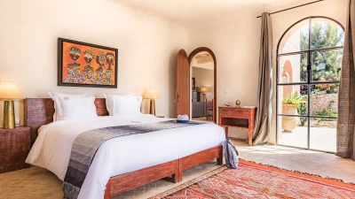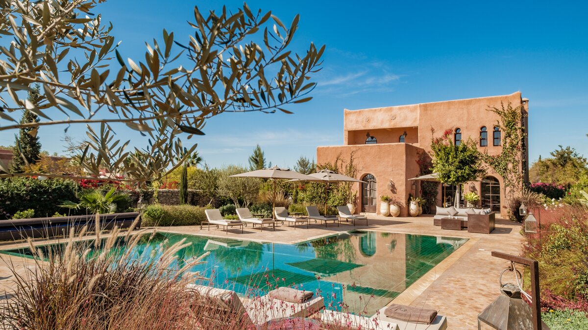 Villa Juniper is one of six very spacious fully-staffed private villas, all with private gardens set within the grounds of a small hotel.  All the villas include décor that showcases the bright and exotic fabrics and tiles for which Morocco is well known. The bedrooms are flexibly furnished and can be made up as either double or twin and are of a consistent size, with air conditioning and either a bath or shower room en suite. The spacious living rooms catch the cooling breezes, and open on to a broad terrace, with al fresco sitting and dining areas, each with a beautiful pool with Moroccan tiling. Villa Juniper is one of the latest villas, finished in 2019.  One bedroom on the ground floor opens out to the terrace. The master bedroom on the first floor opens out to the upper terrace.