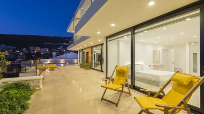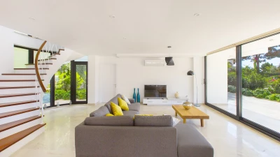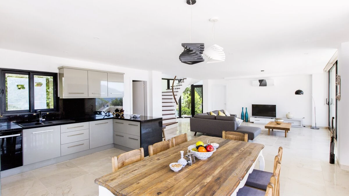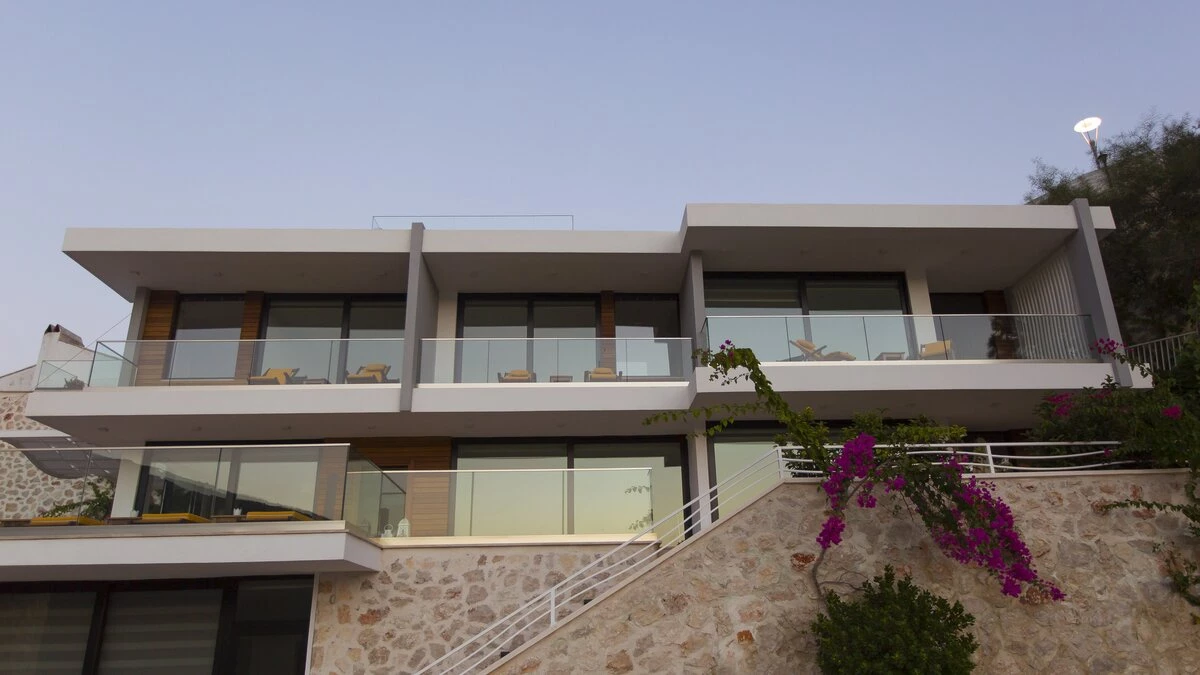 Set over three levels, Villa Kalamar includes an independent annexe on the lower ground floor comprising a bedroom and bathroom, ideal for teenagers or grandparents, with four additional bedrooms in the main house spread across the ground and first floors. Each bedroom in the main house opens onto balconies overlooking Kalamar Bay, while the first-floor rooms benefit from generous fitted wardrobe space.
