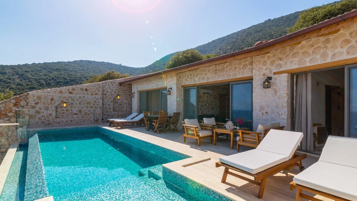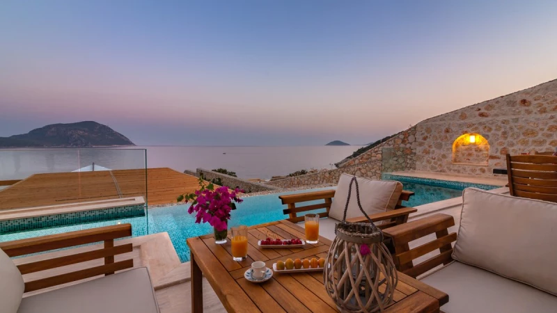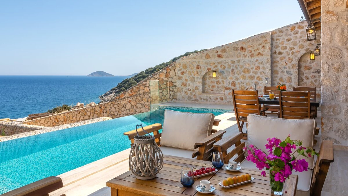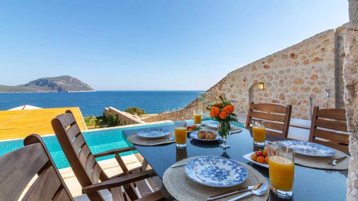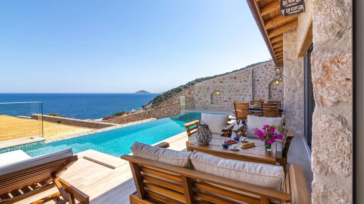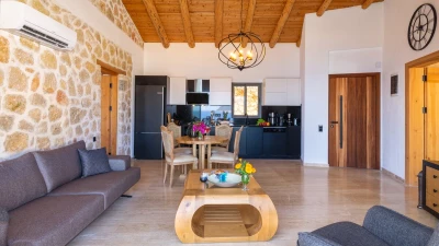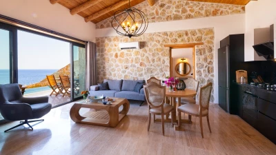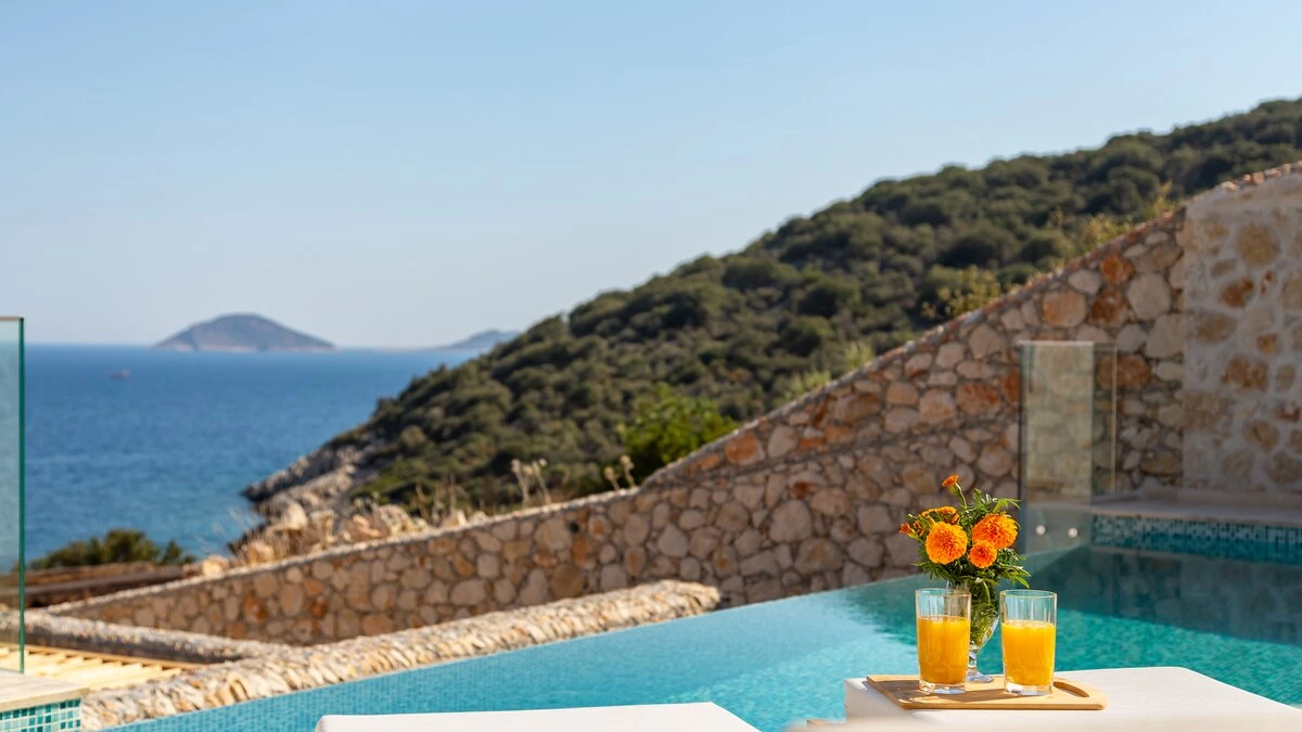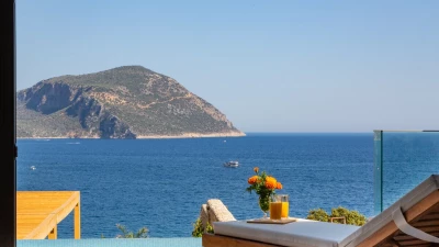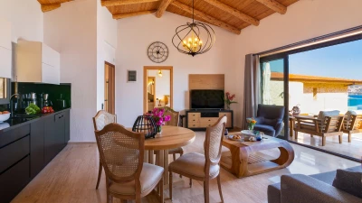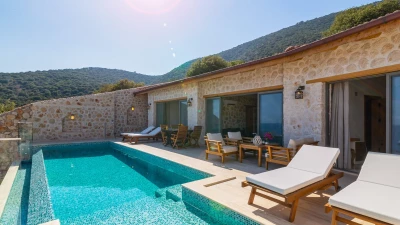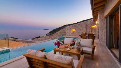 Offering a quiet and romantic retreat in the west side of Kalamar Bay, Villa Keyali is a spacious and stylish property in Kalkan. The villa is contemporary and minimalist, with plenty of natural light across all rooms. The living and dining area is large and well lit, with a well-equipped kitchen space that is decorated in a sleek, monochrome style. There are two bedrooms in this villa, a double and a twin, both paired with a lovely en suite shower room. Step out onto the terrace and you'll find extraordinary sea views from all outdoor living areas. There is a table for al fresco dining, a lounge area and a fabulous infinity pool which blurs into the blue of the sea beyond.