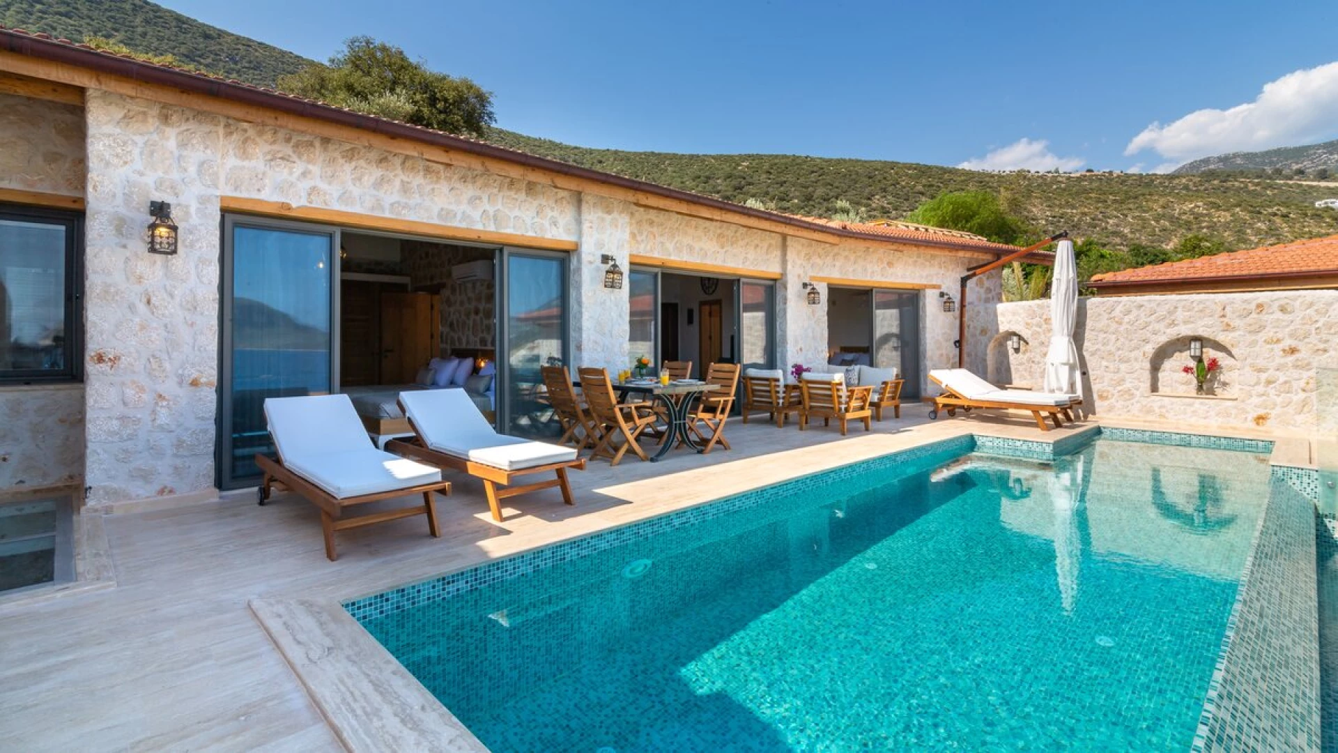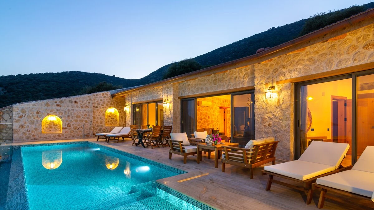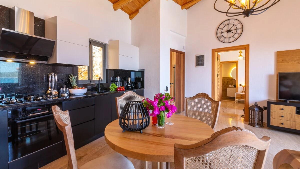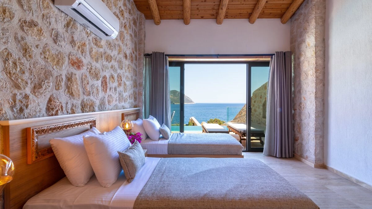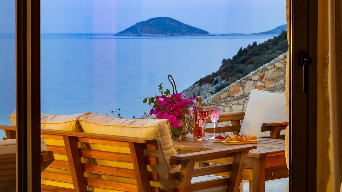 Offering a quiet and romantic retreat in the west side of Kalamar Bay, Villa Keyali is a spacious and stylish property in Kalkan. The villa is contemporary and minimalist, with plenty of natural light across all rooms. The living and dining area is large and well lit, with a well-equipped kitchen space that is decorated in a sleek, monochrome style. There are two bedrooms in this villa, a double and a twin, both paired with a lovely en suite shower room. Step out onto the terrace and you'll find extraordinary sea views from all outdoor living areas. There is a table for al fresco dining, a lounge area and a fabulous infinity pool which blurs into the blue of the sea beyond.
