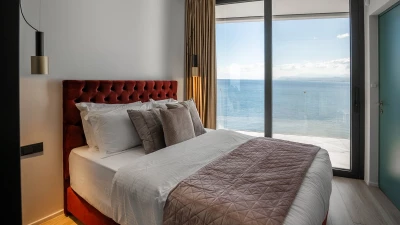 The ground floor unfolds into a graceful open‑plan living, dining, and kitchen area, framed by expansive sliding doors that dissolve the boundary between interior and terrace. From here, the infinity pool appears to spill into the bay below, creating a serene backdrop for leisurely breakfasts, relaxed afternoons, or elegant evenings under the Cretan sky. A master double bedroom with an ensuite bathroom completes this level, offering convenience and comfort.