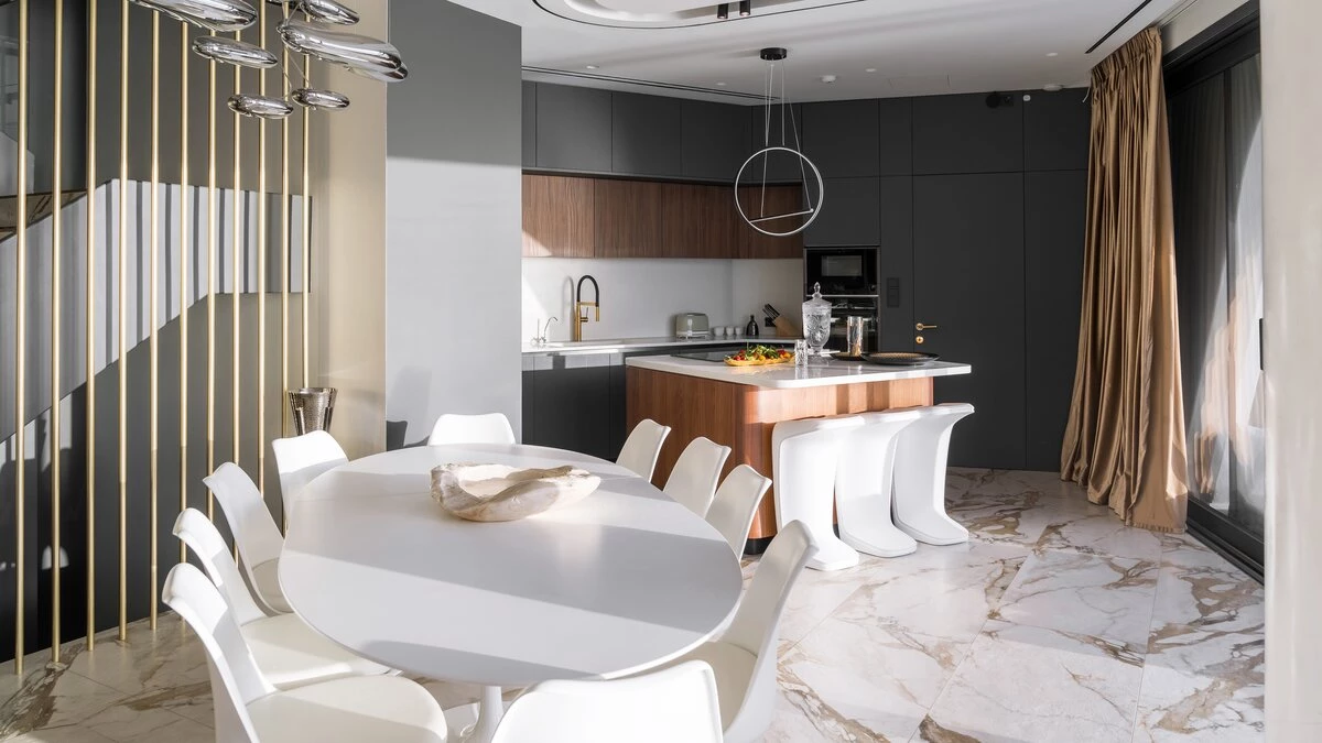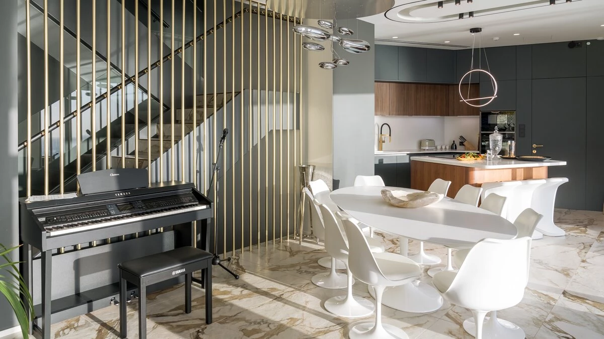 The lower level offers a sense of seclusion, hosting a master double bedroom with an ensuite bathroom and private kitchenette. A fully equipped gym is also located on this floor, allowing guests to maintain their wellness routine throughout their stay.