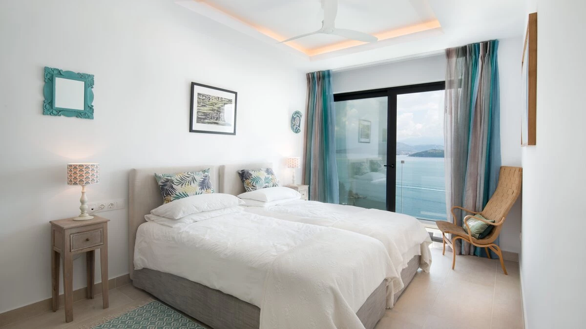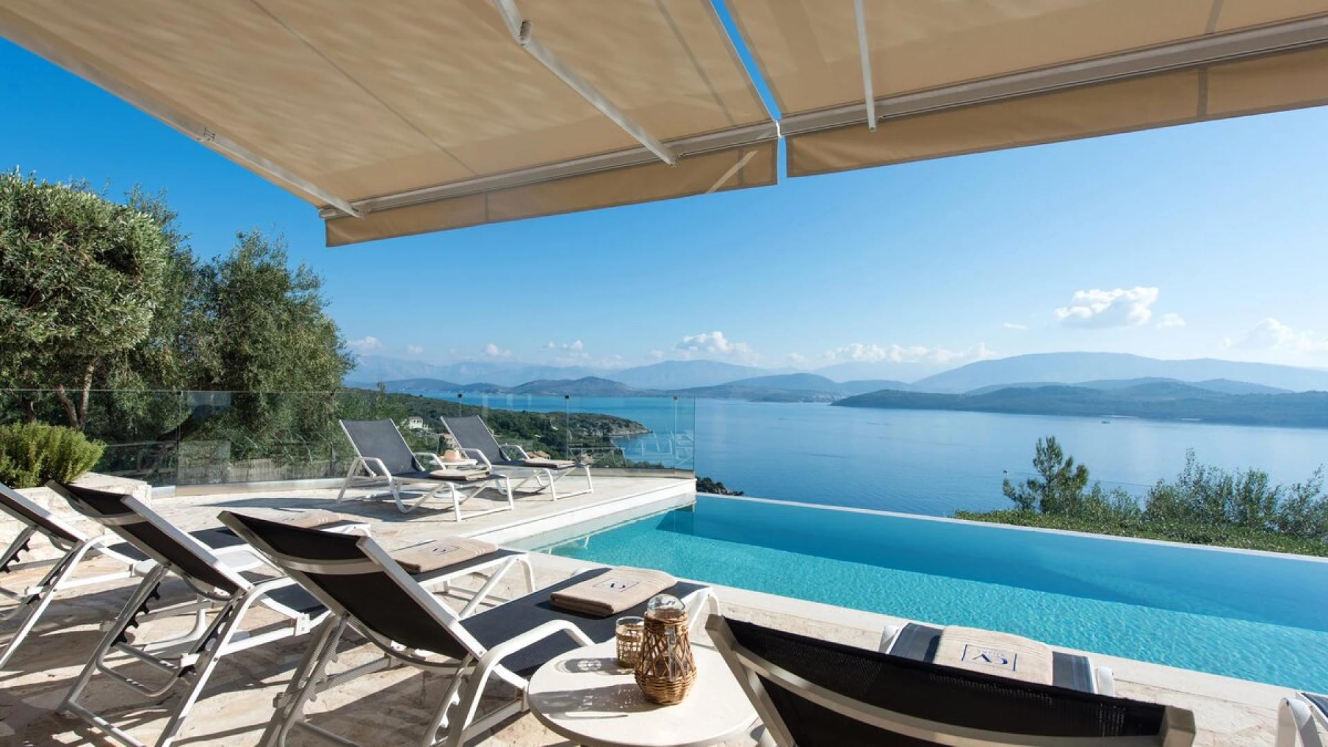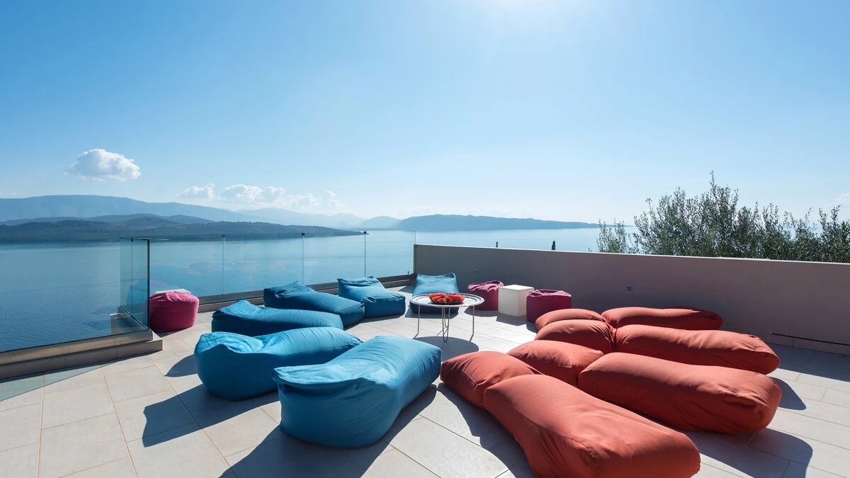 Villa Kyvos has been thoughtfully designed with views in mind and stunning vistas across the sea to Albania can be enjoyed from almost everywhere in the house. A short stroll from both exclusive St Stephano with its selection of excellent tavernas as well as Kerasia’s beautiful pebble beach, this contemporary luxury villa is perfect for a relaxing holiday and well equipped for entertaining. On the ground floor the modern kitchen and seating/dining area, furnished in an eclectic contemporary style, open out to the dazzling infinity pool and wraparound terrace leading to a dining table with barbecue area. Also on this floor is the master bedroom, opening to the terrace and with bathroom en suite. There are four bedrooms on the first floor, one double and three twins, all with showers en suite opening into the room and separate WCs en suite. Each bedroom on this floor looks out to sea and each has access to a small balcony. The spectacular roof terrace is a real highlight, with panoramic views along the coastline, a well-equipped summer kitchen and a lovely shaded dining area to enjoy dinner at sundown.