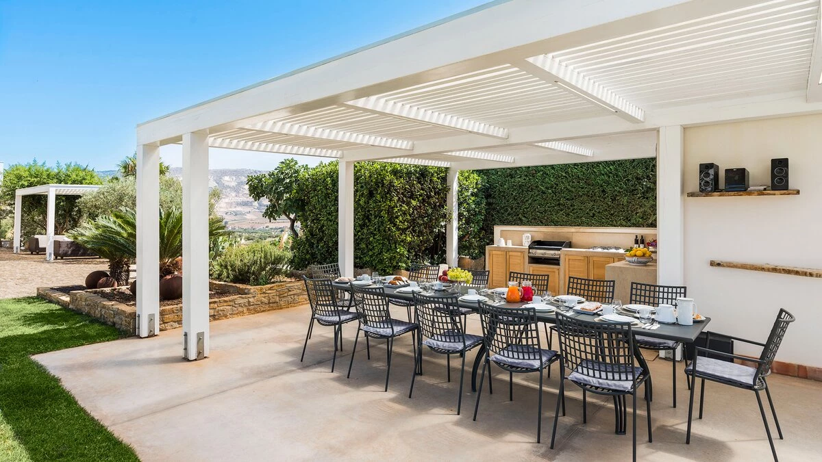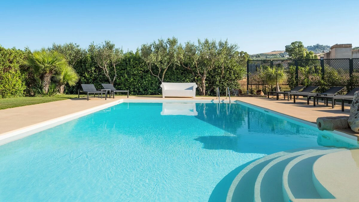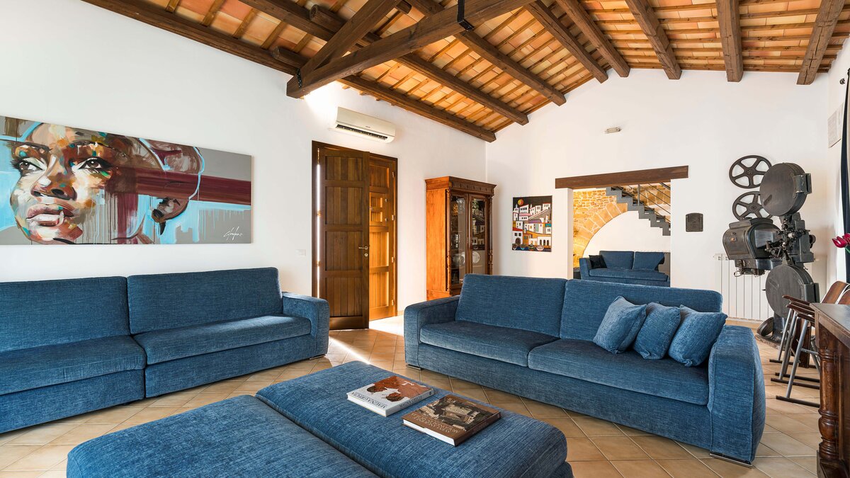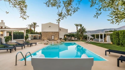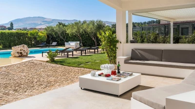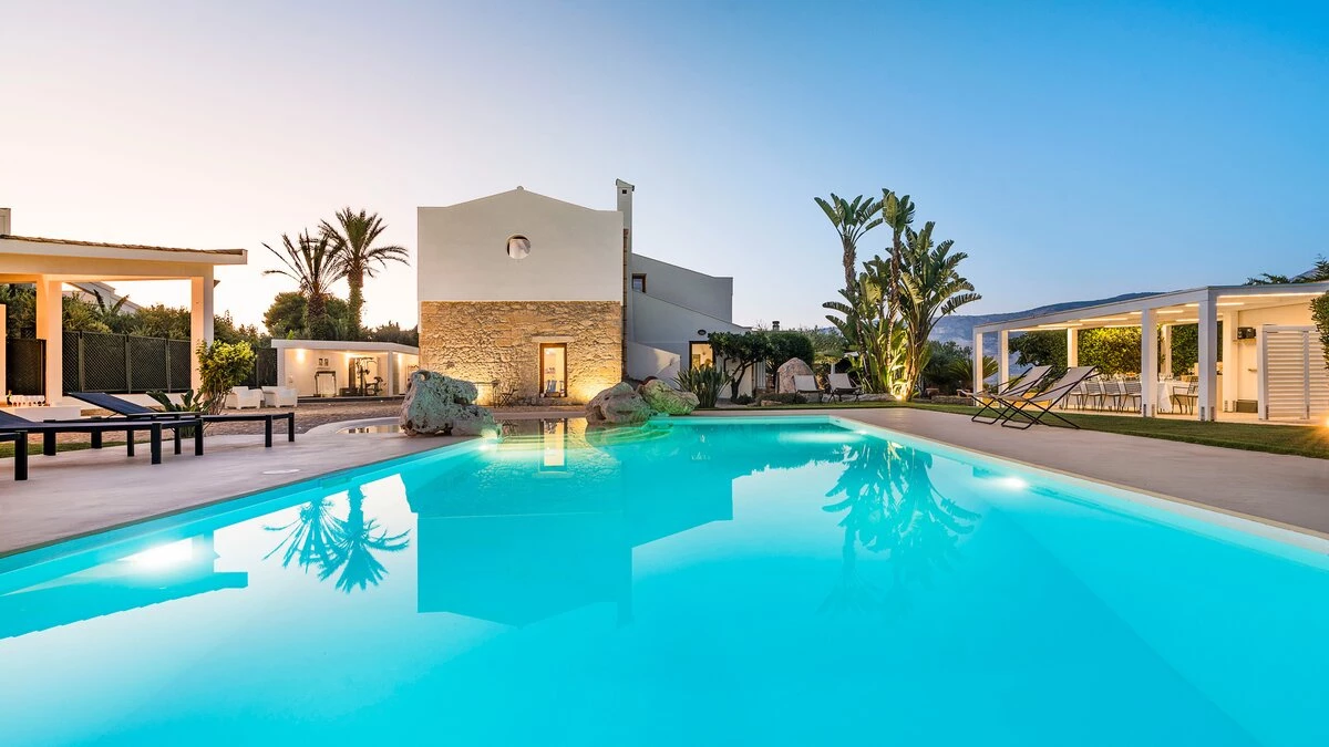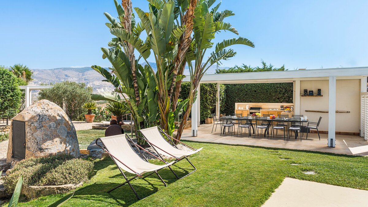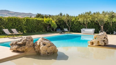 A rambling house with raftered ceilings and exposed stone walls, La Costa looks out to rural views which bring a literal meaning to the term ‘picture windows’. Wonderfully well planned for big get-togethers, the villa has eight air-conditioned bedrooms, beautifully furnished in rich wood and local linens; a cool white dining room with contemporary furniture on an old stone floor; and a very spacious sitting room, divided into two areas and designed in stylish monochrome, with Sicilian ceramics adding earthy, arty touches.A wine cellar, eight TV’s, and a baby grand piano are thoughtful additions within the house, while colour-washed exterior walls add a warm glow to its delightful cobbled courtyard terraces, which are home to a sunny seating area and poolside dining gazebo. Framed by big boulders, and with a wade-in section and wide stone steps into the water, the twelve metre swimming pool is irresistibly tempting. Well placed for sightseeing, the villa is just 1km from amenities in the little hill village of Buseto Palizzolo, and 15km from Scopello’s sandy beach.
