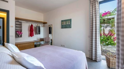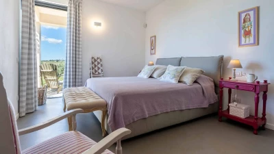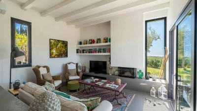 Designed on a single level, the villa opens into a bright and welcoming open-plan living space with a cosy lounge furnished with sofas and armchairs arranged around a modern fireplace, ideal for relaxed holiday living. A few steps lead up to the stylish dining area and well-equipped kitchen, beautifully defined by a sleek central peninsula with induction hob, where polished concrete floors, exposed beam ceilings and expansive glass doors create a light-filled and spacious ambience while allowing seamless access to the main terrace and far-reaching views across the landscape. A corridor leads to the peaceful sleeping quarters, comprising three well-appointed bedrooms: a master double with en-suite shower room and direct access to the pool terrace, a second double bedroom with lovely views and doors opening onto the main terrace and pool area, and a flexible double or twin bedroom with access to a quieter, shaded terrace, making the villa ideal for families or small groups of friends.