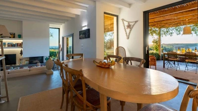 Outdoor living centres on the generous front terrace, perfect for sunbathing, relaxing or dining al fresco while enjoying sweeping views over the vineyards towards the shimmering sea, particularly enchanting at sunset. A large covered porch, accessed from both the living and dining areas, provides a shaded retreat with an elegant outdoor lounge and dining table, ideal for leisurely meals and evening aperitivi. Steps lead down to the stunning infinity pool, which appears to float between the lush greenery and the blue horizon beyond, facing directly towards the sea and forming the heart of the villa’s outdoor experience.