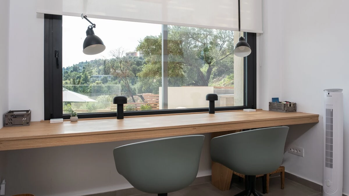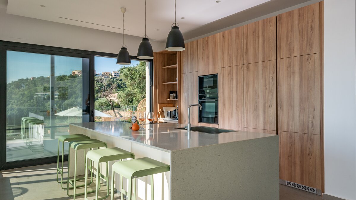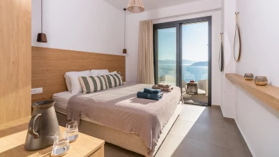 The ground floor of Villa Lefkothea is designed with an open plan concept that maximises space and natural light. It features a spacious living area with large windows and sliding doors that frame breathtaking sea views. The fully equipped kitchen boasts modern appliances and an island unit, perfect for socialising. Adjacent to the kitchen is a separate study, ideal for quiet moments or remote work. Both of the two bedrooms are both complete with shower room en suites, ensuring extra privacy for guests.