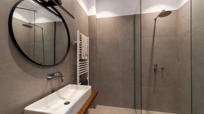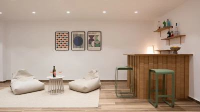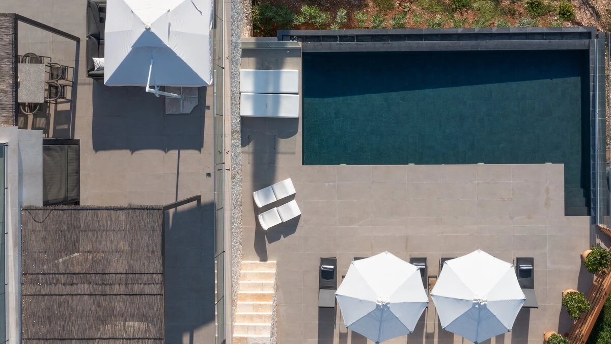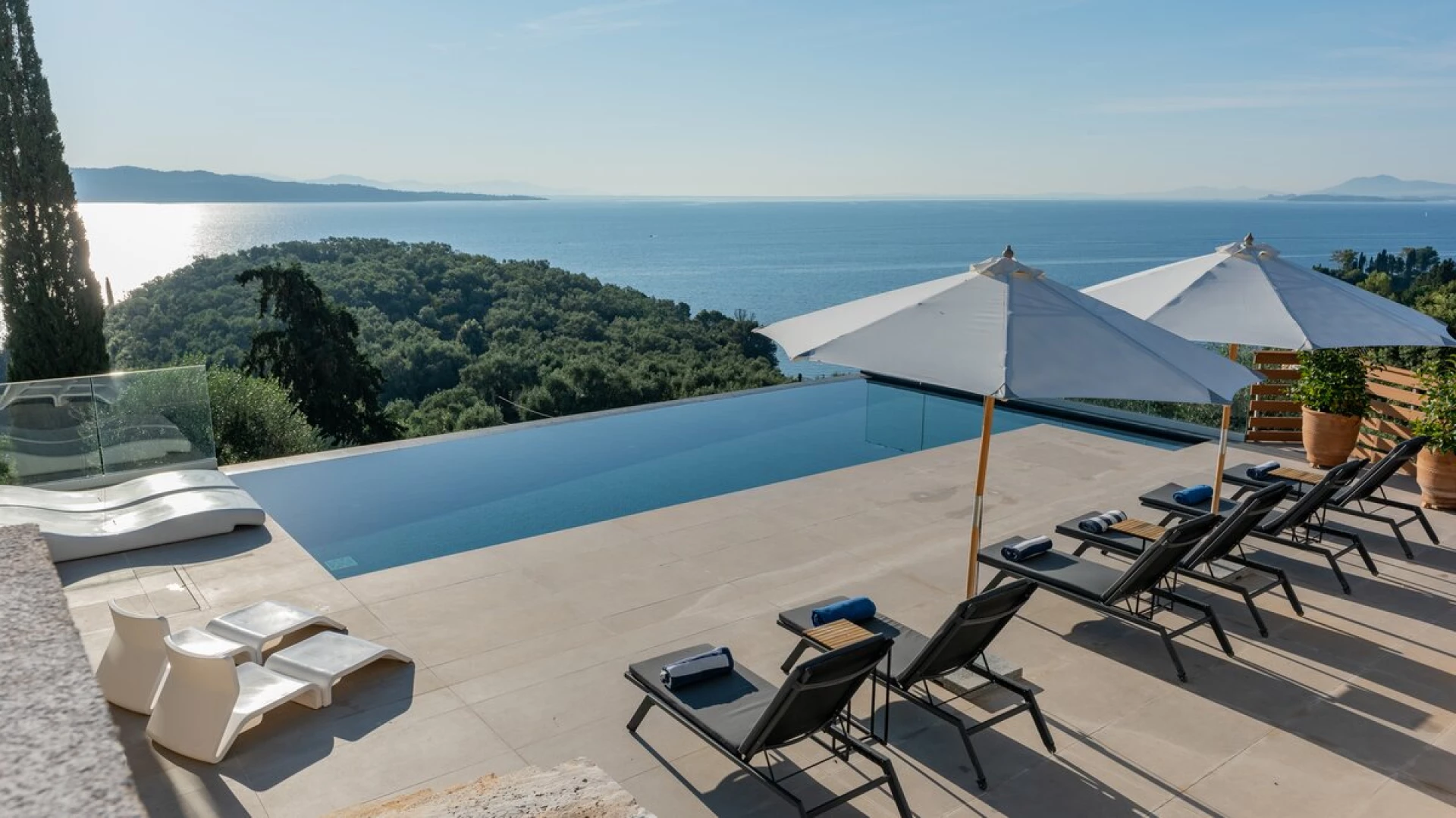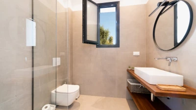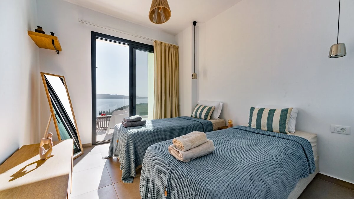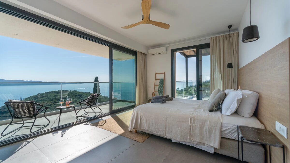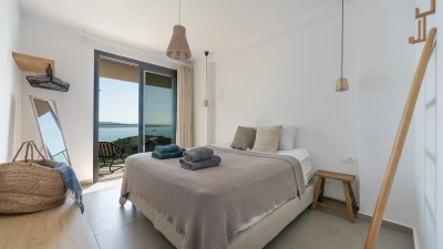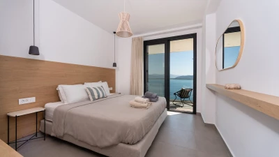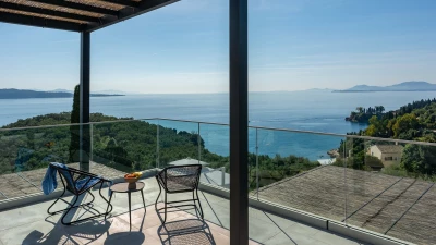 The first floor elevates the villa's charm with its intimate spaces designed for relaxation. Each bedroom on this level features en suites adorned in neutral tones, creating a tranquil atmosphere. The interiors are characterized by white tones with subtle accents of beiges, complementing the villa’s peaceful ambiance. All bedrooms open up to terraces that overlook the azure waters below, offering guests uninterrupted views of Corfu’s natural beauty.
