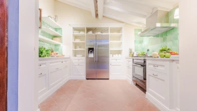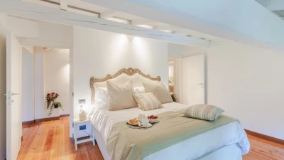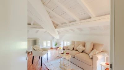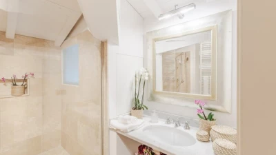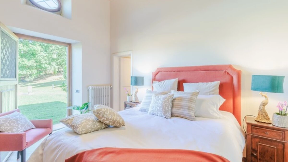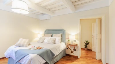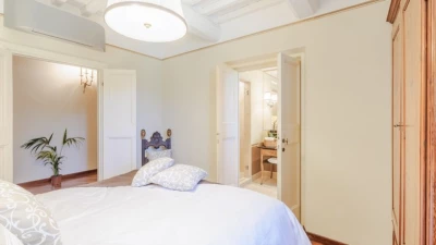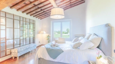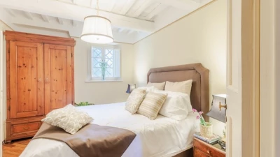 The villa sleeps up to 10 guests across five elegantly furnished bedrooms, each with its own en suite bathroom. The interiors feature original architectural details, such as rustic beams and historic flooring, paired with tasteful furnishings and natural materials. An additional sofa bed is available on request, offering flexibility for families.
