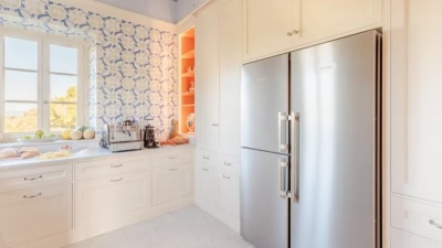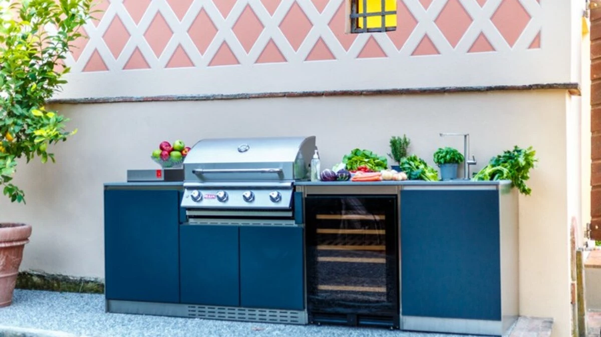 Outdoor kitchen with sink preparation area and wine fridge